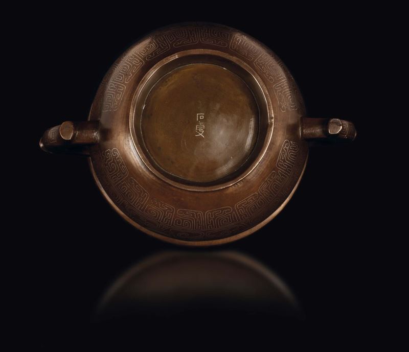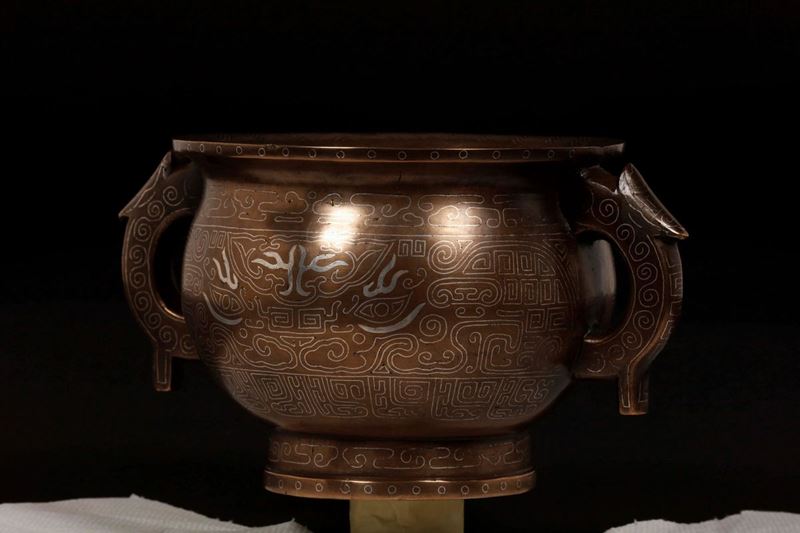 Incensiere in bronzo con decoro d'ispirazione arcaica con maschera taotie in intarsio d'argento , Cina, Dinastia Ming, XVII [..]