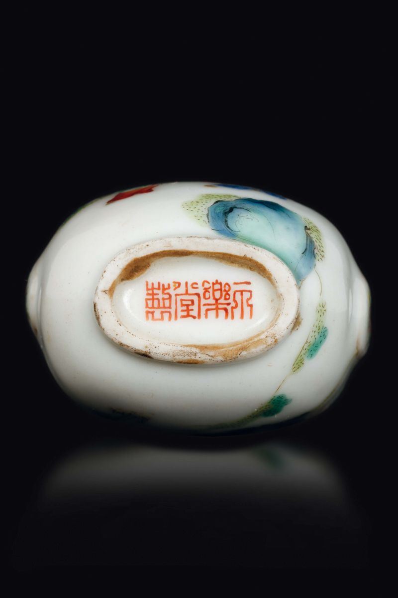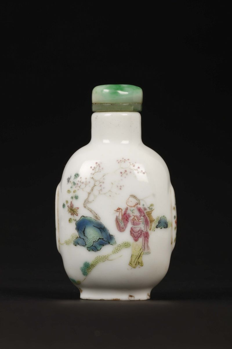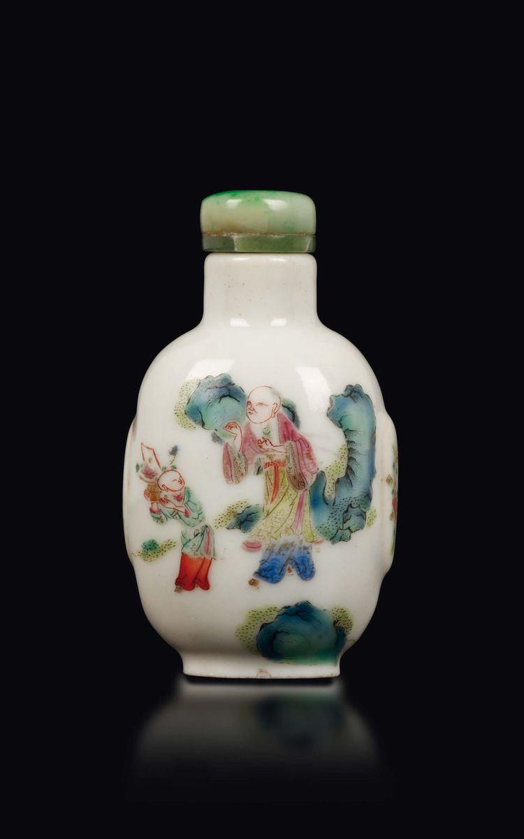 Snuff bottle in porcellana a smalti policromi con saggi e fanciulli, Cina, Dinastia Qing, XIX secolo