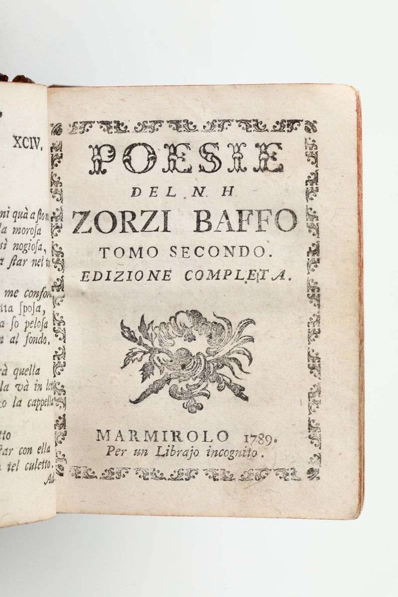 In-24° (mm 78x100). Rarissima edizione in formato tascabile. Legatura coeva a dorso attaccato, presumibilmente inglese. Esemplare che presenta alcuni difetti, soprattutto alle prime carte (facilmente riparabili). Per altro, tenuto conto della qualità della carta su cui è stampato, molto sottile e assai fragile, si tratta di una buona copia. Cinque tomi rilegati insieme (190 pagine al I e al II tomo, che risultano segnati con numerazione continua+96 pagine per il III tomo+96 pagine per il IV tomo+96 pagine per il V tomo).Nella presente edizione, un vero fantasma bibliografico, certamente più rara della prima edizione stampata anonima a Londra nel 1771 e della seconda (o terza) stampata per cura di Lord Pembroke nel 1789, risultano essere presenti 49 poesie non inserite nell'edizione di Cosmopoli,per un numero complessivo di 334 tra sonetti e canzoni.Come è noto, molto materiale attribuibile a Giorgio Baffo circolò in forma manoscritta nella seconda metà del secolo XVIII, e gli anonimi curatori di questa nostra edizione tascabile possono aver attinto ad una grande disponibilità di carte. Riguardo al luogo di stampa, Marmirolo, potrebbe trattarsi di un falso luogo di stampa. Un vero enigma bibliografico meritevole di studio e approfondimenti.