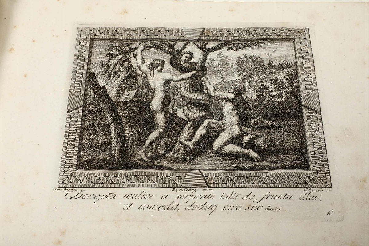 In-4° oblungo. Legatura in mezza tela con piatti marmorizzati. Cinquantadue tavole racchiuse in varie cornici architettoniche con decori e figure il tutto inciso in rame da Secondo Bianchi su disegni del Bartolozzi e di Raffaello.
