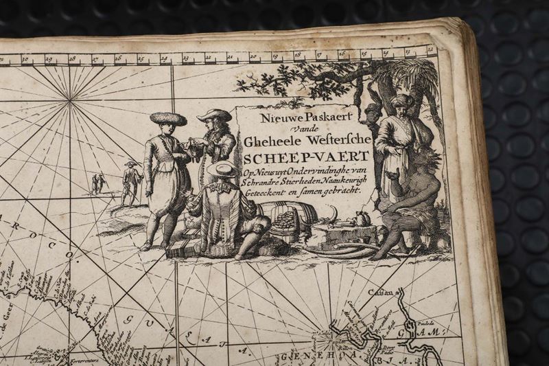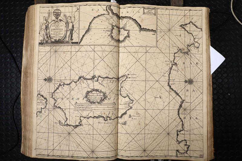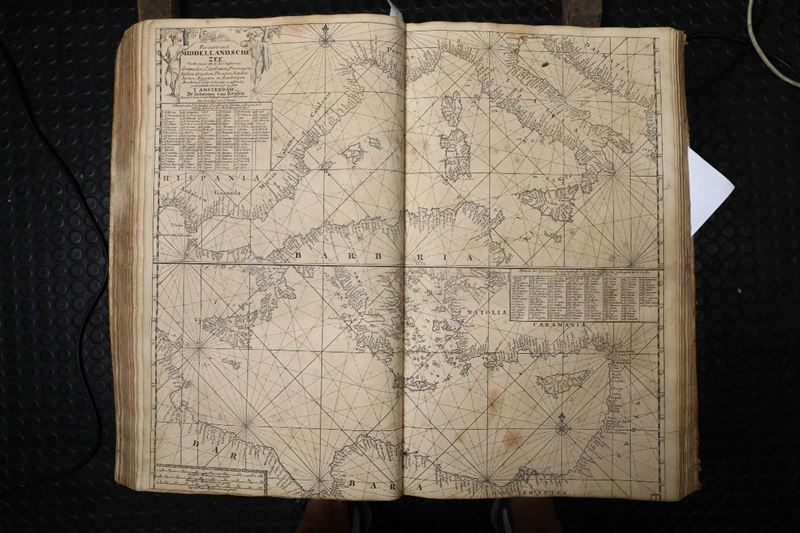 In-folio. Legatura coeva in piena pergamena. Due parti rilegate insieme. Bruniture,macchie non gravi e piccoli strappi ad alcune carte. (Prima parte:)Frontespizio inciso+38 carte nautiche a doppia pagina numerate con cifre arabe + 2 carte nautiche a doppia pagina non numerate.( Seconda parte:) Frontespizio inciso+XVII carte nautiche a doppia pagina numerate con cifre romane.