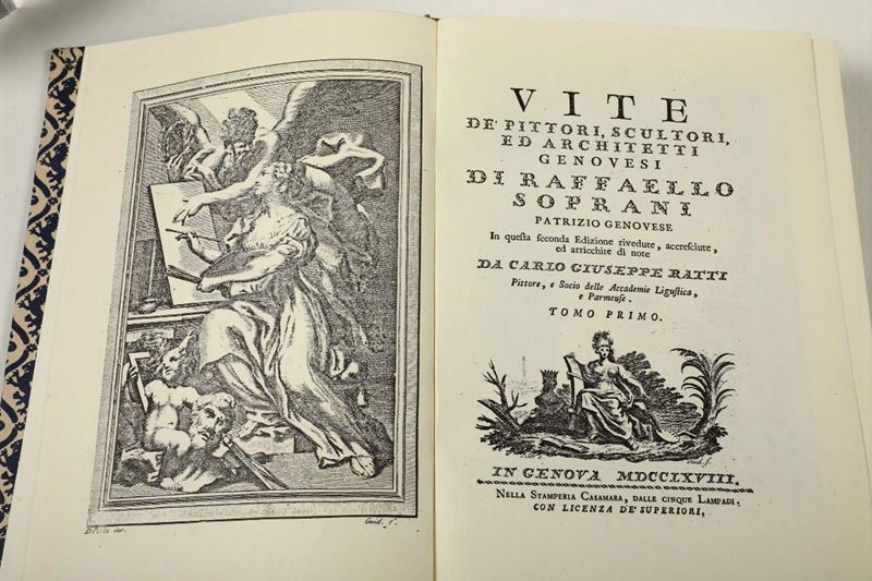 In-folio. Legatura in mezza pergamena e punte dei primi del 900. Tra pagina 4 e pagina 5 bella e grande carta topografica ripiegata del genovesato (restauri e difetti). Esemplare fresco, marginoso e in barbe. Si aggiunge nel lotto una edizione del Soprani-Ratti, Vite dei pittori, scultori e architetti genovesi, che si compone del primo volume in edizione anastatica (Bologna, Forni, 1969) e del secondo volume in edizione originale (Genova, Casamara, 1779).