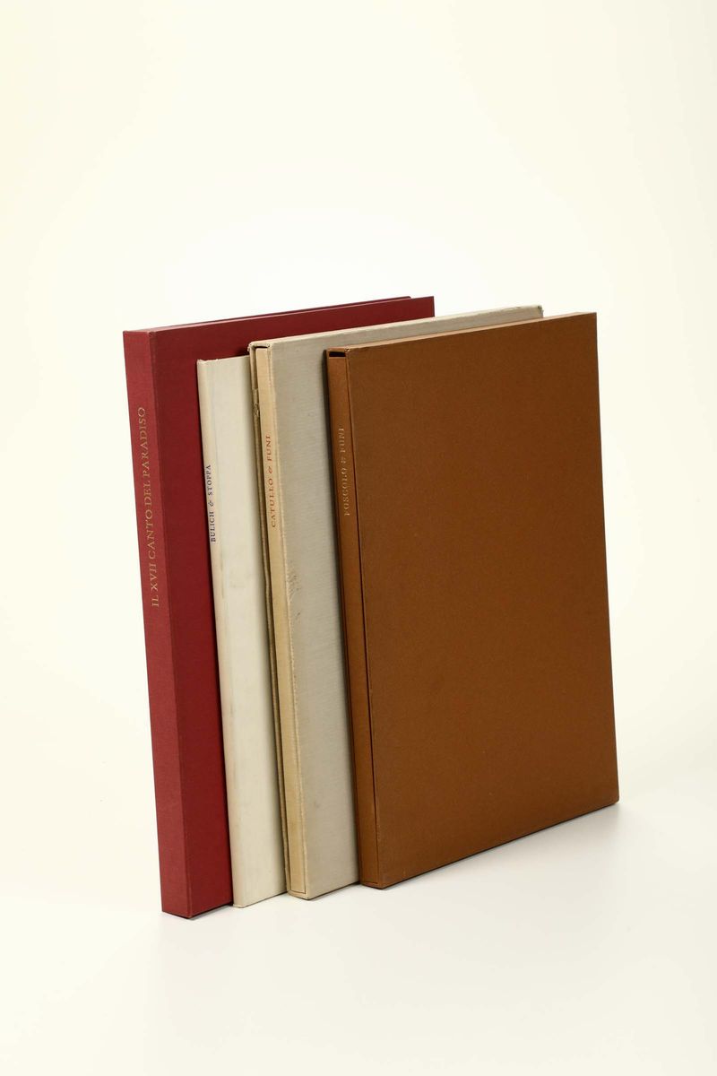 Lotto composto da: I poeti illustrati, Dante, XVII canto del paradiso, ornato acquaforte Arnoldo Ciarrocchi, Franco Riva editiones Dominicae, cofanetto tela rosa antico, vol 11/120 Edito 1977 cm 40x28 - I poeti illustrati, parabole, Saul Buliche acquaforte di Paolo Stoppa, Franco Riva editiones Dominicae, anno 1967 rilegato in tela beige. Cm 38x27 - I poeti illustrati, Catulli veronensis ad lesbiam, due acqueforti di Achille funi , Franco Riva editiones Dominicae, anno 1965, vol.139/150 rilegato in cartone color tortora cm 38x29 - I poeti illustrati, dei Sepolcri di Ugo Foscolo, ornato da due litografia di Achille Funi, vol 39/150 Franco Riva editiones Dominicae, anno 1966, rilegato in cartoncino marrone, cm 37x27