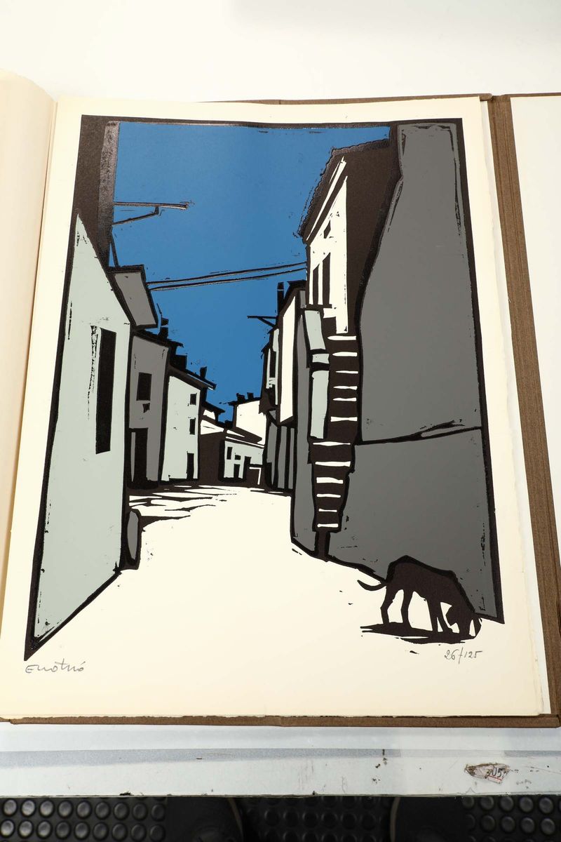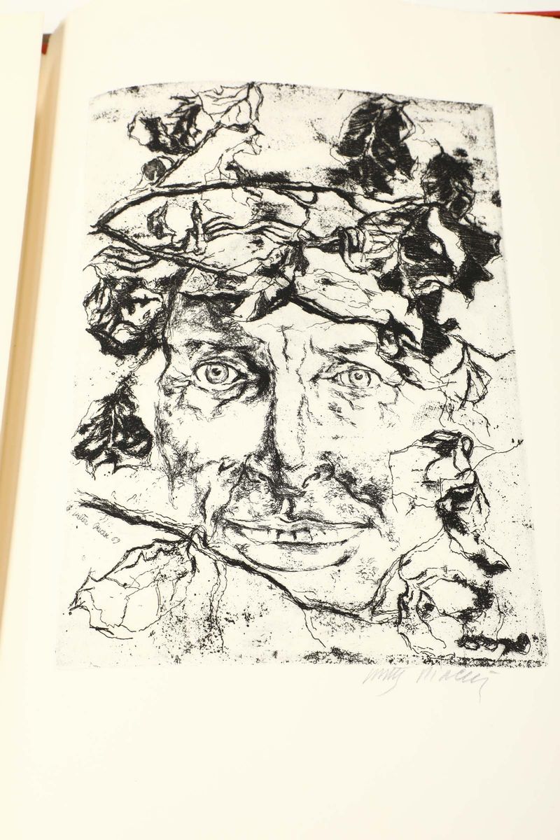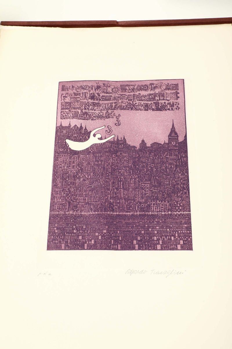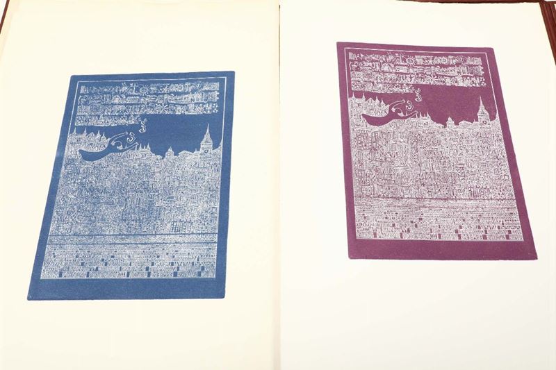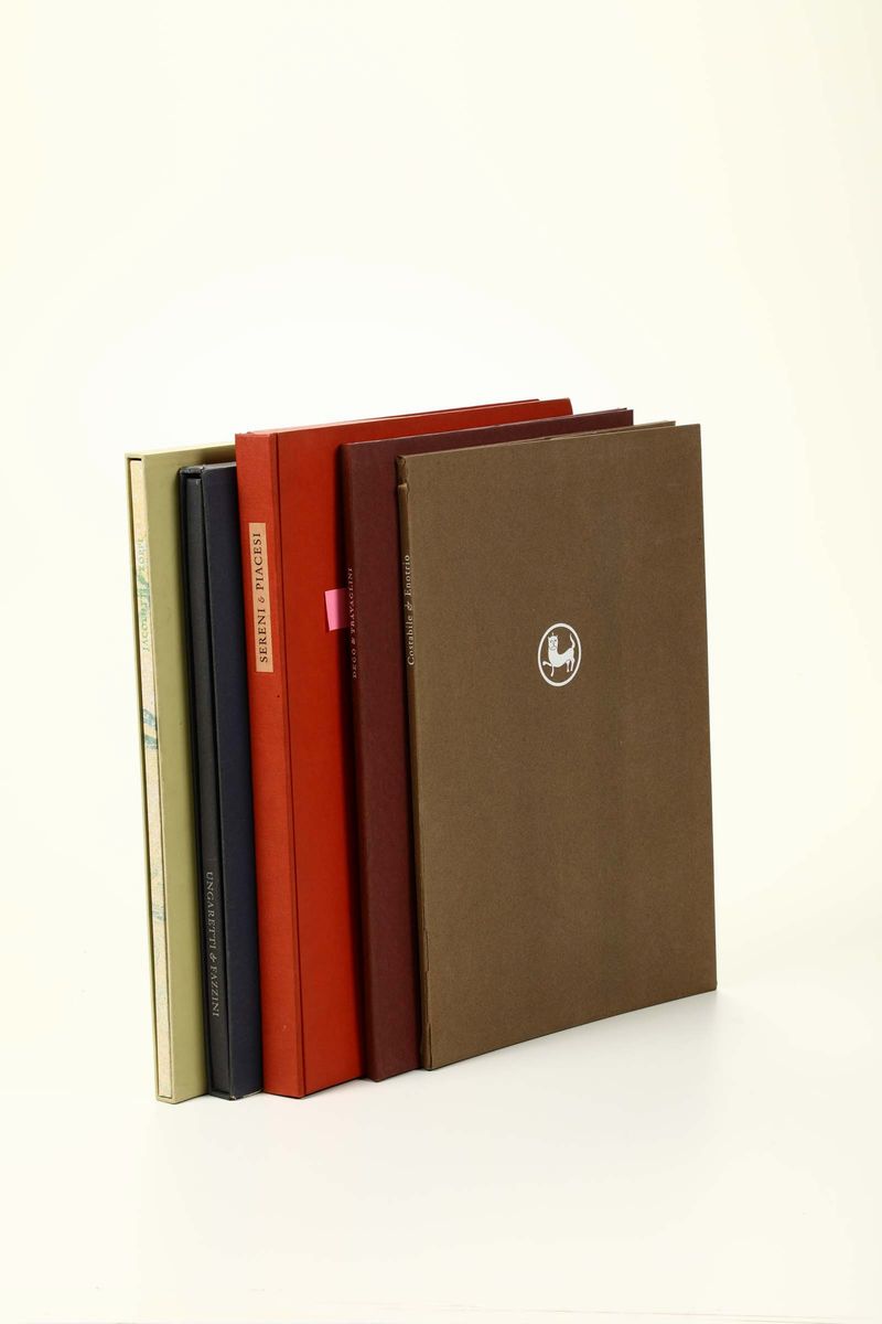 Lotto composto da: (I quaderni dei poeti illustrati 1)-Franco Costabile, Cammina con Dio, con una litografia a colori di Enotrio Pugliese, Editiones Dominicae Franco Riva (n.26/125), Verona 1966, cm 37x26 - Giuliano Dego, Da Piccadilly a Westminster, con 1 Acquaforte Edgardo Travaglini (con prova in negativo d’Acquaforte e prova d’ Artista), Franco Riva (n.5/130), Verona 1972, cm 37x27 - (I Poeti Illustrati ) - Vittorio Sereni, Poesie, con tre Acqueforti di Walter Piacesi, Editiones Dominicae Franco Riva (n.6/150), Verona 1970, cm 37x27 - (I Poeti Illustrati IX) - Giuseppe Ungaretti, Inni, con tre Acqueforti di Pericle Fazzini, Editiones Dominicae Franco Riva (n.63/150), Verona 1965, cm 36x27 - Giacolutti, La mosca sulla rosa, con 1 Acquaforte di Moreno Zoppi, Franco Riva (n.20/100), In rure Polliano, 1977, cm 38x27