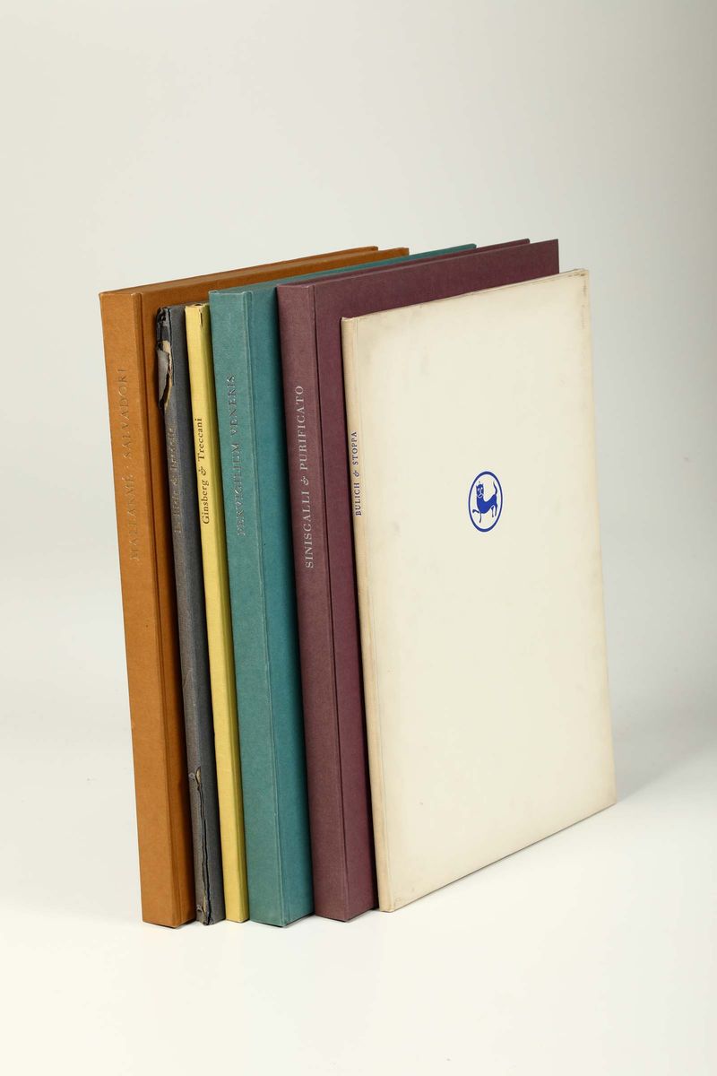 Lotto composto da: Saul Bulich, Parabole, con una Acquaforte colorita di Paolo Stoppa, Editiones Dominicae Franco Riva (n.11/125), Verona 1967, cm 38x28 - (I quaderni dei poeti illustrati IX)- E. Blair, As night comes on, con una Acquaforte a due colori di Luigi Pradella, Editiones Dominicae, Franco Riva (n.11/125) Verona 1970, cm 38x28 - (I quaderni dei poeti illustrati 8)- Allen Ginsberg, Sutra del Girasole, con una acquaforte a colori di Ernesto Treccani, Editiones Dominicae Franco Riva (n. 11/140), Verona 1968, cm 38x28 - (I Poeti Illustrati XIX)- Stéphane Mallarmé, L’aprés-midi d’un faune, brise marine l’azur, con quattro litografie a colori di Aldo Salvadori (riservate alle prime 15 copie), Editiones Dominicae Franco Riva (n.6/120, Verona 1973, cm 38x28 - Leonardo Sinisgalli, Elegie, con tre Acqueforti di Domenico Purificato, Editiones Dominicae Franco Riva (n.8/125), Verona 1975, cm 40x29 - Pervigilium Veneris, con due litografie a colori di Enrico della Torre, più suite di litografie per i primi 9 esemplari, Editiones Dominicae (n.6/160), Verona 1972, cm. 40x30