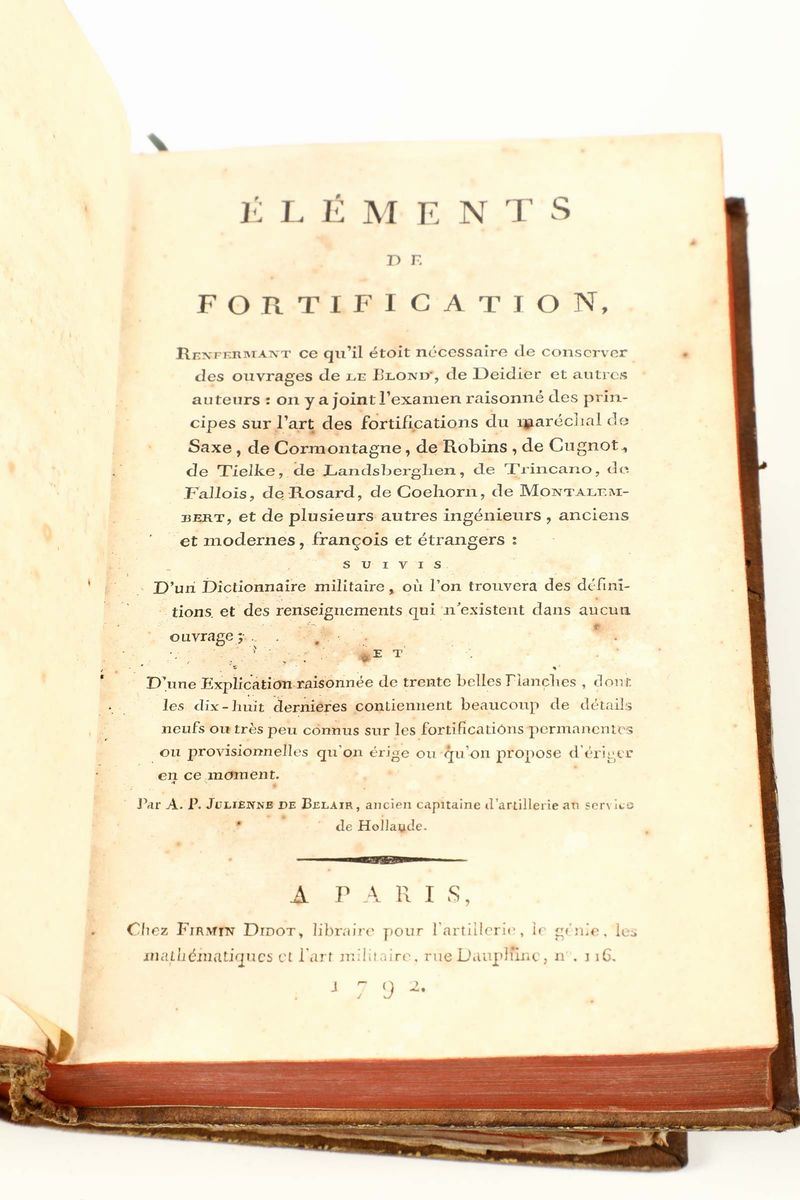 In-folio. Legatura in brossura editoriale a stampa. Con dedica di Fumagalli. Unito nel lotto: (Gasparo Saint-Paul Noizet), Elements de fortification..Paris,Didot,1792. 2 voll. Legature in pelle coeva. Ex libris dell'ingegnier Giacomo Brusco.