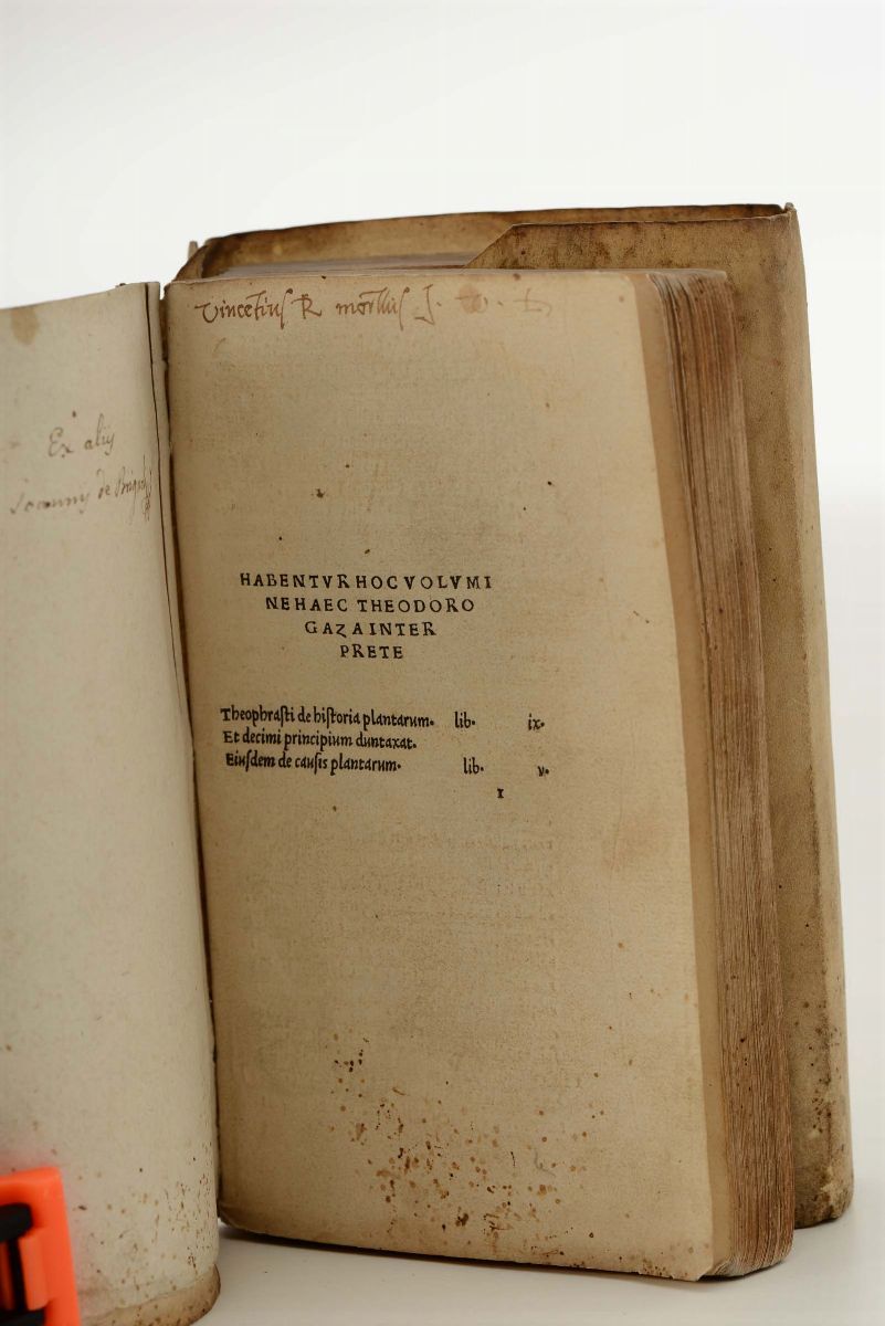 Habentur hoc volumine haec Theodoro Gaza interprete..Theophrasti de historia plantarum. Et decimi principium duntaxat. Eiusdem de causis plantarum, senza luogo nè data ma presumibilmente Lione,1505
