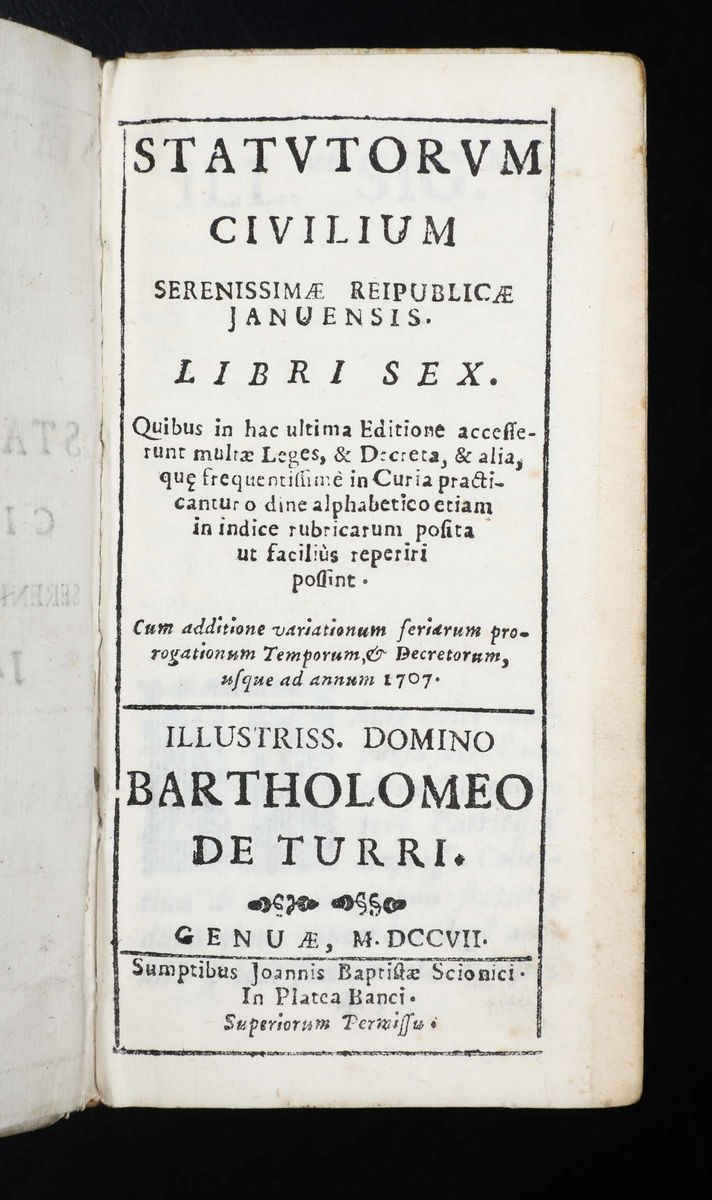 Genova e Savona - Statuti civili Statutorum civilium serenissimae repubblicae Januensis..Genuae,Scionici,1707 /Statutorum [..]