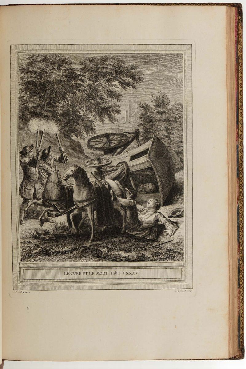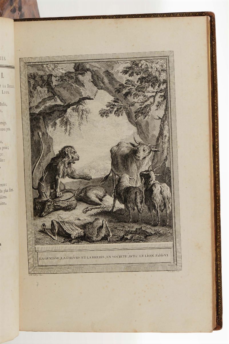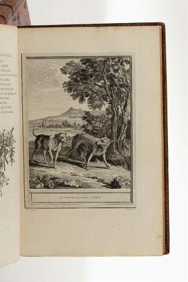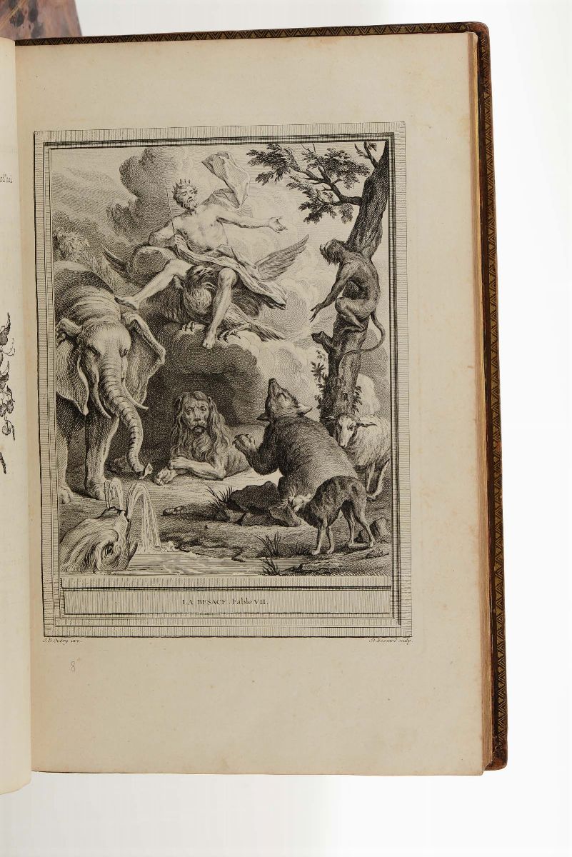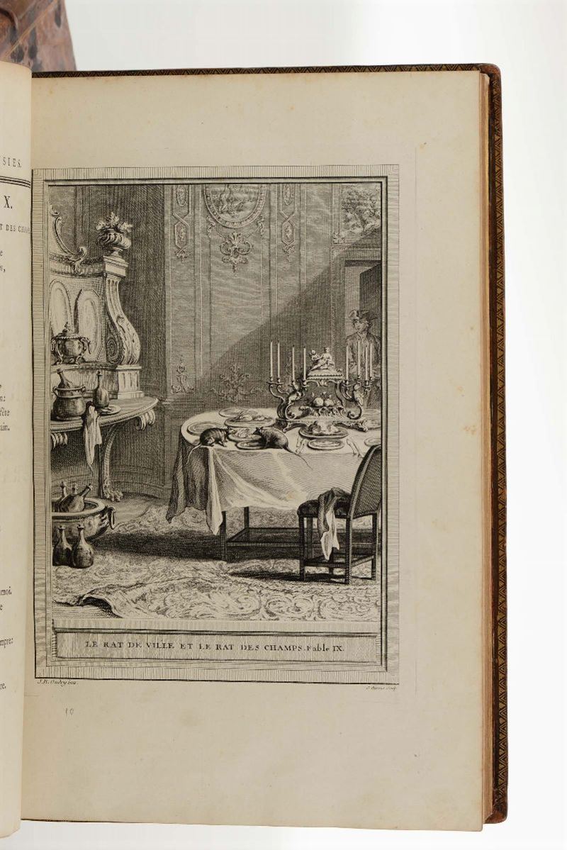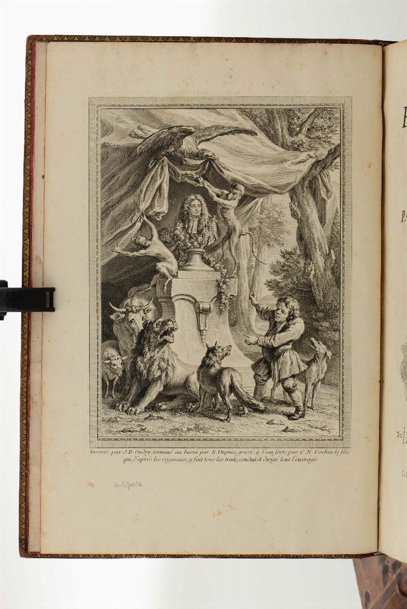 In-folio. Legature coeve in piena pelle maculata, lievissime abrasioni e piccoli difetti ai dorsi abilmente restaurati. Con magnifici rami disegnati da Jean-Baptiste Oudry e incisi da vari artisti. Tutte le tavole sono in prima tiratura tranne la tavola della scimmia che è in seconda tiratura. Esemplare fresco e bellissimo.