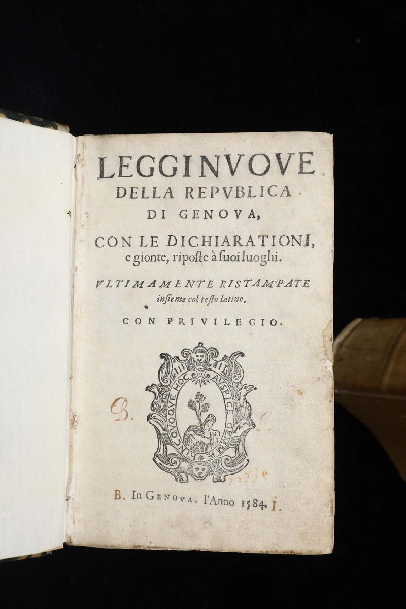 Leggi genovesi Leggi Nuove della Republica di Genova, Genova, senza stampatore (Antonio Roccatagliata), 1584