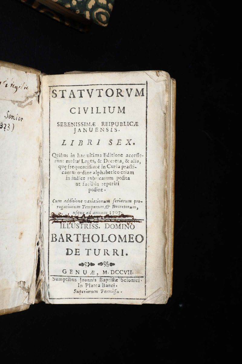 In-8°. Legatura in mezza pergamena del secolo XIX. Ultimo quaderno anteposto per errore del legatore. Al lotto si aggiunge: Statutorium civilium, Libri sex, Genova, Scionico, 1707. In-12°. Legatura antica in pergamena rigida.