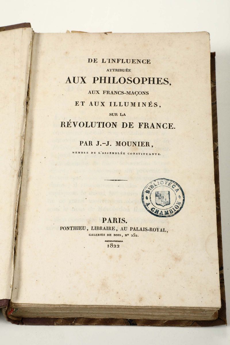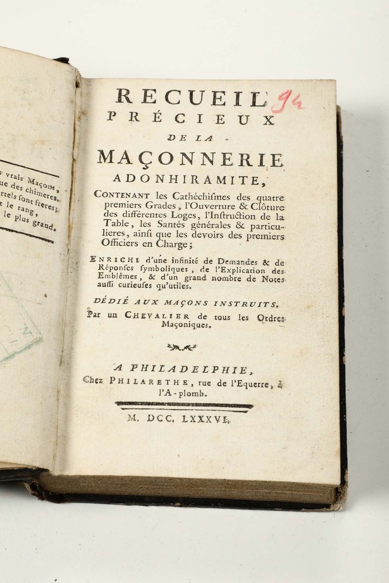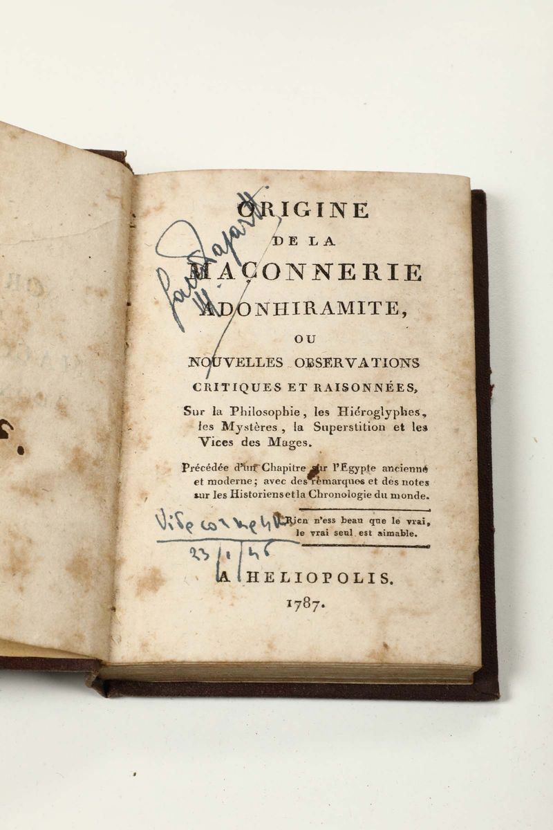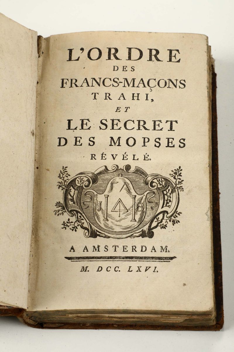 In-12°. A Amsterdam, 1766 (per la prima opera) e A Jerusalem, 1767(per la seconda opera). Legatura coeva in piena pelle con abrasioni. Con 8 + 5 tavole di note musicali alla prima opera e frontespizio inciso alla seconda opera. Si aggiungono nel lotto altri tre libri di argomento massonico. Abrasioni e difetti.