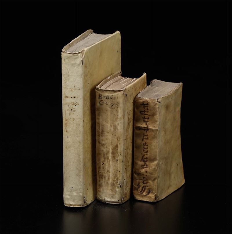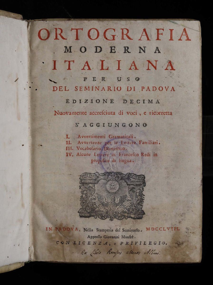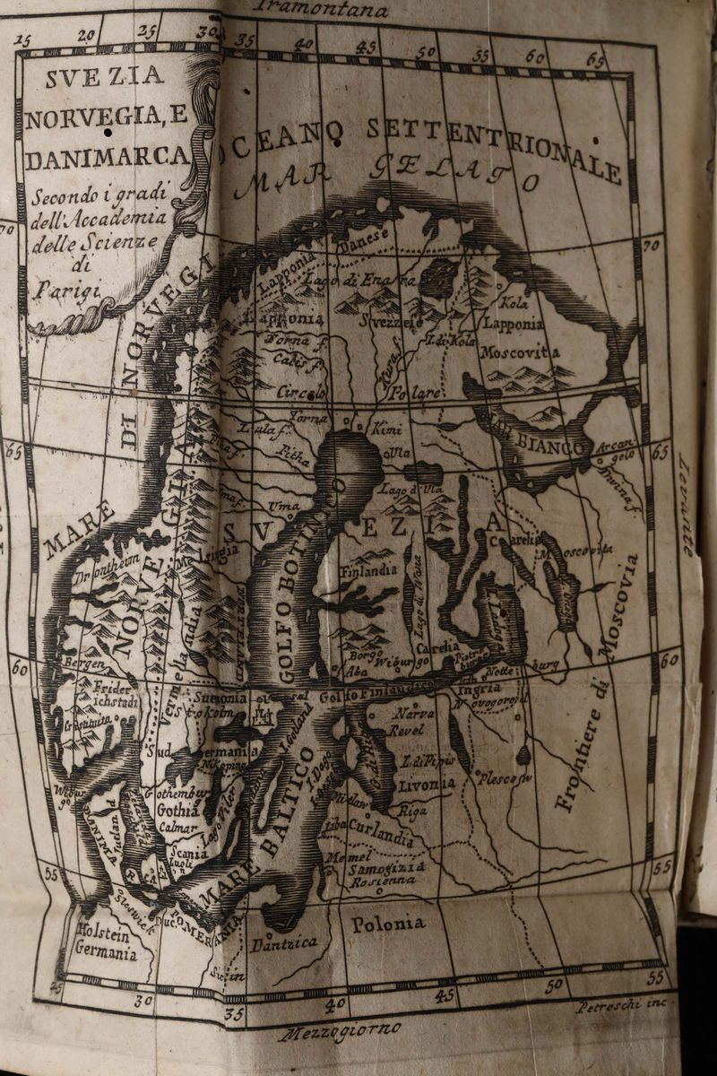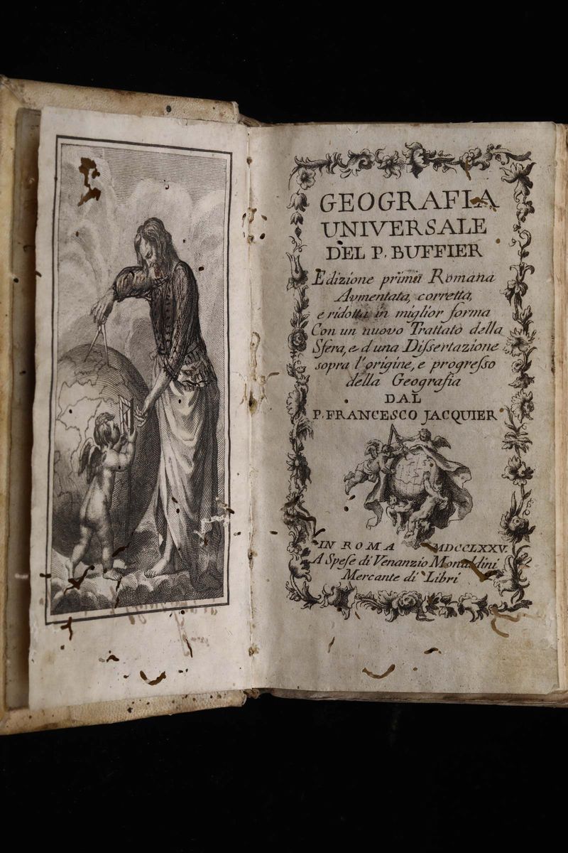 In-8°. Legatura coeva in pergamena floscia. Piccoli fori di tarlo ma nel complesso buon esemplare genuino. Si uniscono nel lotto: Buffier, P., Geografia universale del P. Buffier, Roma, Monaldini, 1775 e Ortografia moderna italiana per uso del seminario di Padova, Padova, Stamperia del seminario, 1758 (timbro al frontespizio).