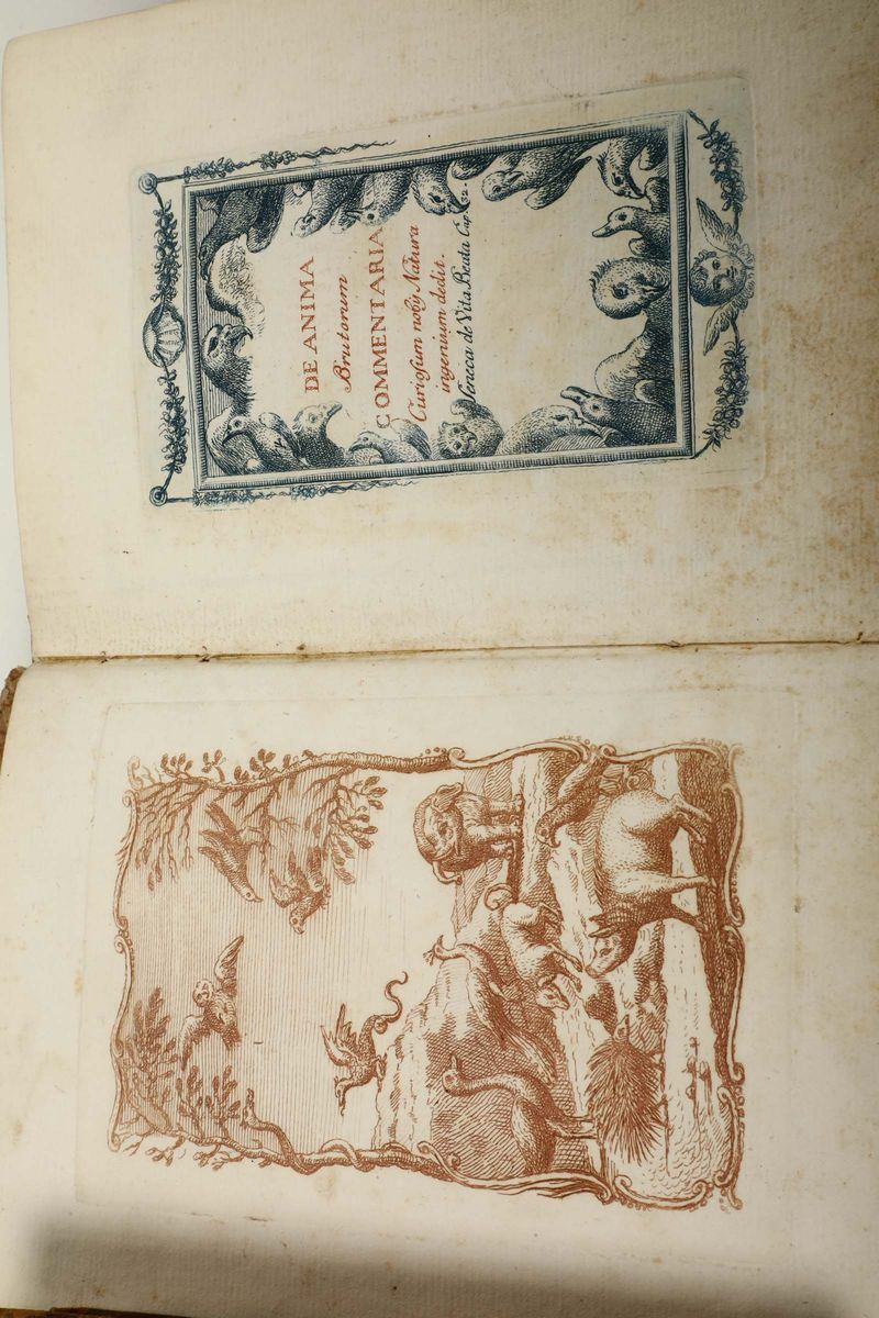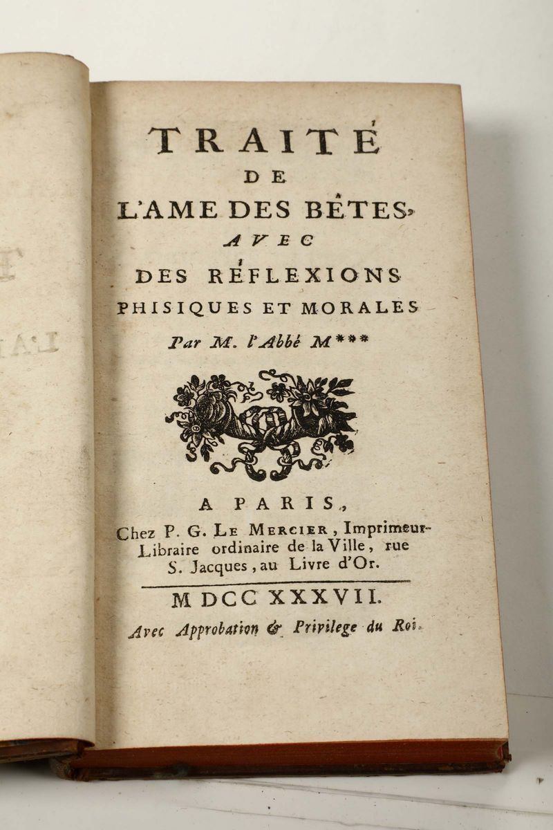 In-8°. Legatura coeva in cartoncino alla rustica. Bell’esemplare fresco e in barbe. Con tavole incise nelle tonalità dell’azzurro, del verde e del seppia. Si unisce nel lotto: Traité de l’ â mes des bêtes..., Parigi, Le Mercier, 1737. Legatura coeva in piena pelle.
