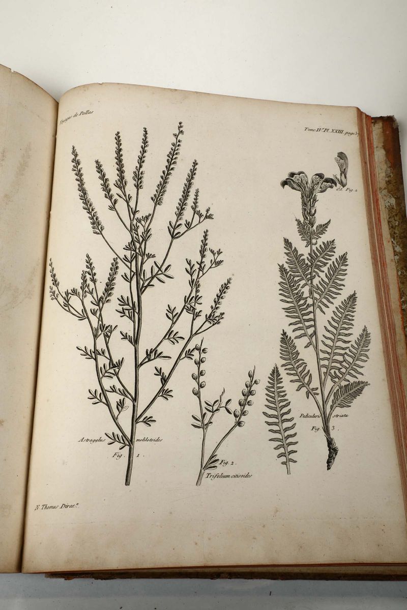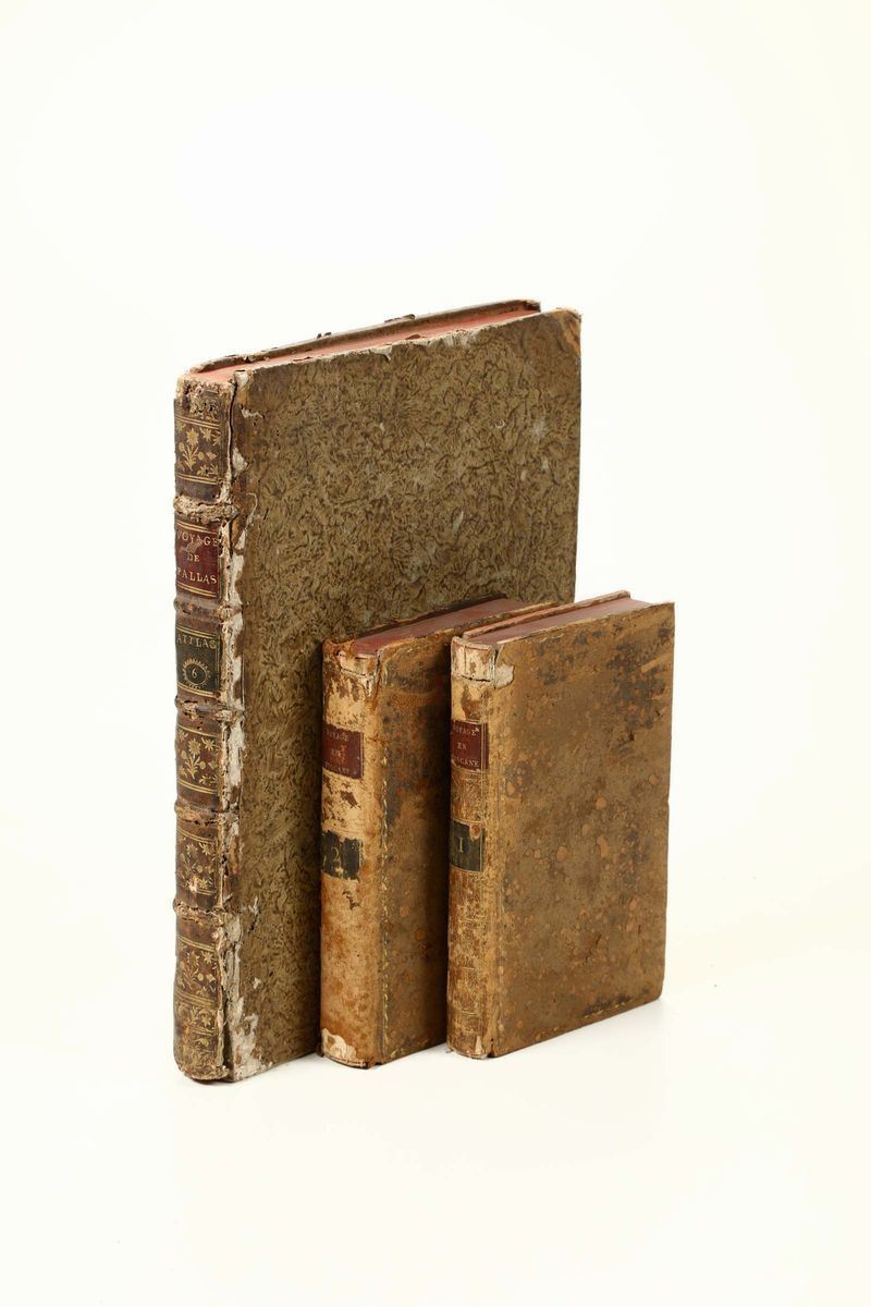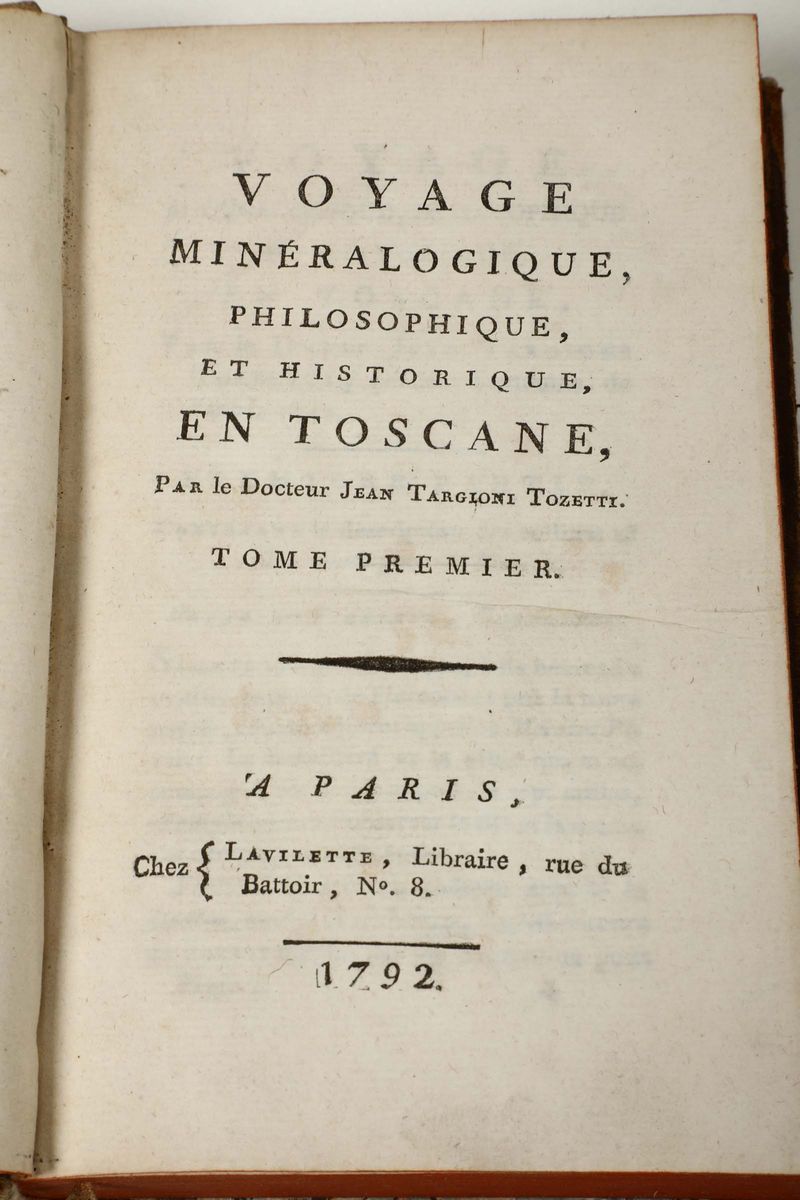 In-folio. Legatura coeva in mezza pelle e punte (cerniere rotte, abrasioni e altri difetti). Bella raccolta di tavole. Mancano i volumi di testo. Si aggiunge nel lotto: Targioni Tozzetti, Jean, Voyage mineralogique, 2 tomi, Paris, Lavilette, 1792. Legature coeve in piena pelle (abrasioni e difetti)