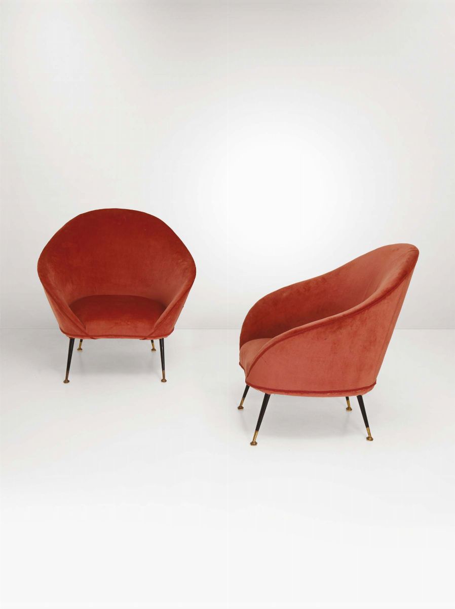 Coppia di poltrone con struttura in legno e rivestimento in tessuto. Supporti in metallo laccato ed ottone lucido.