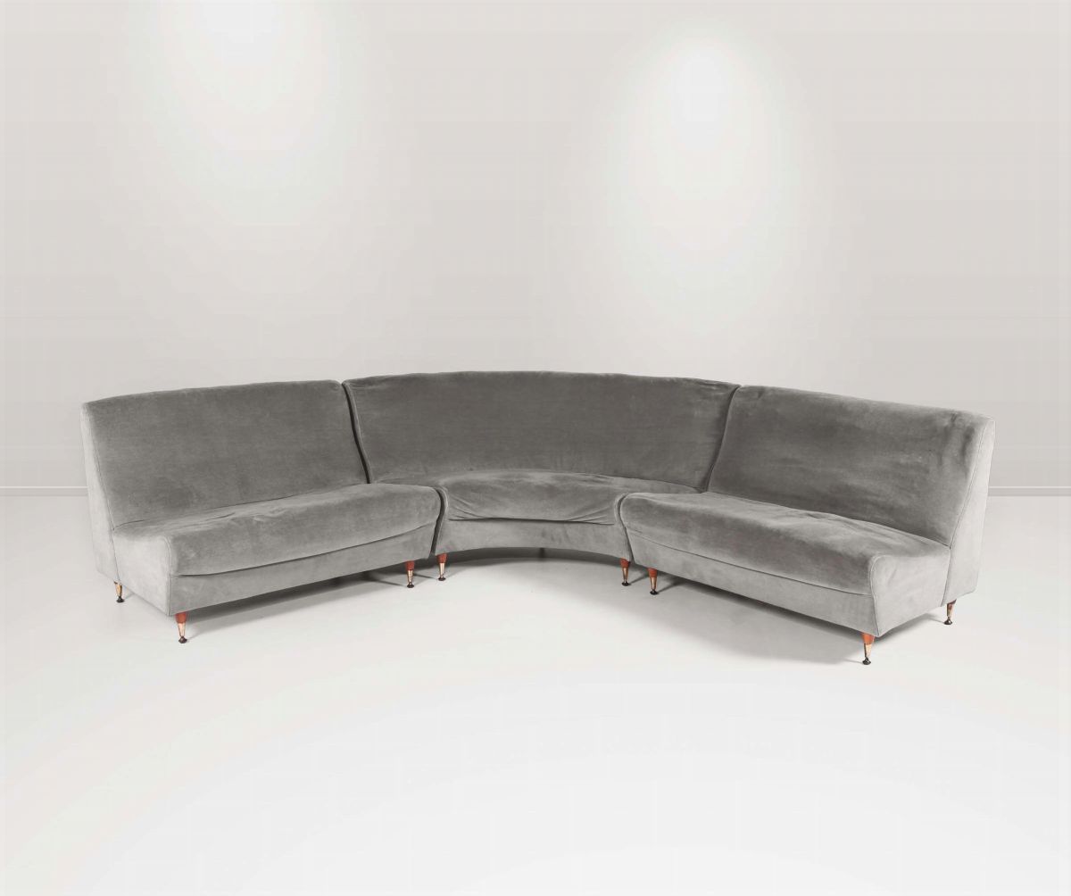 Divano in legno con puntali in ottone e rivestimenti in velluto.