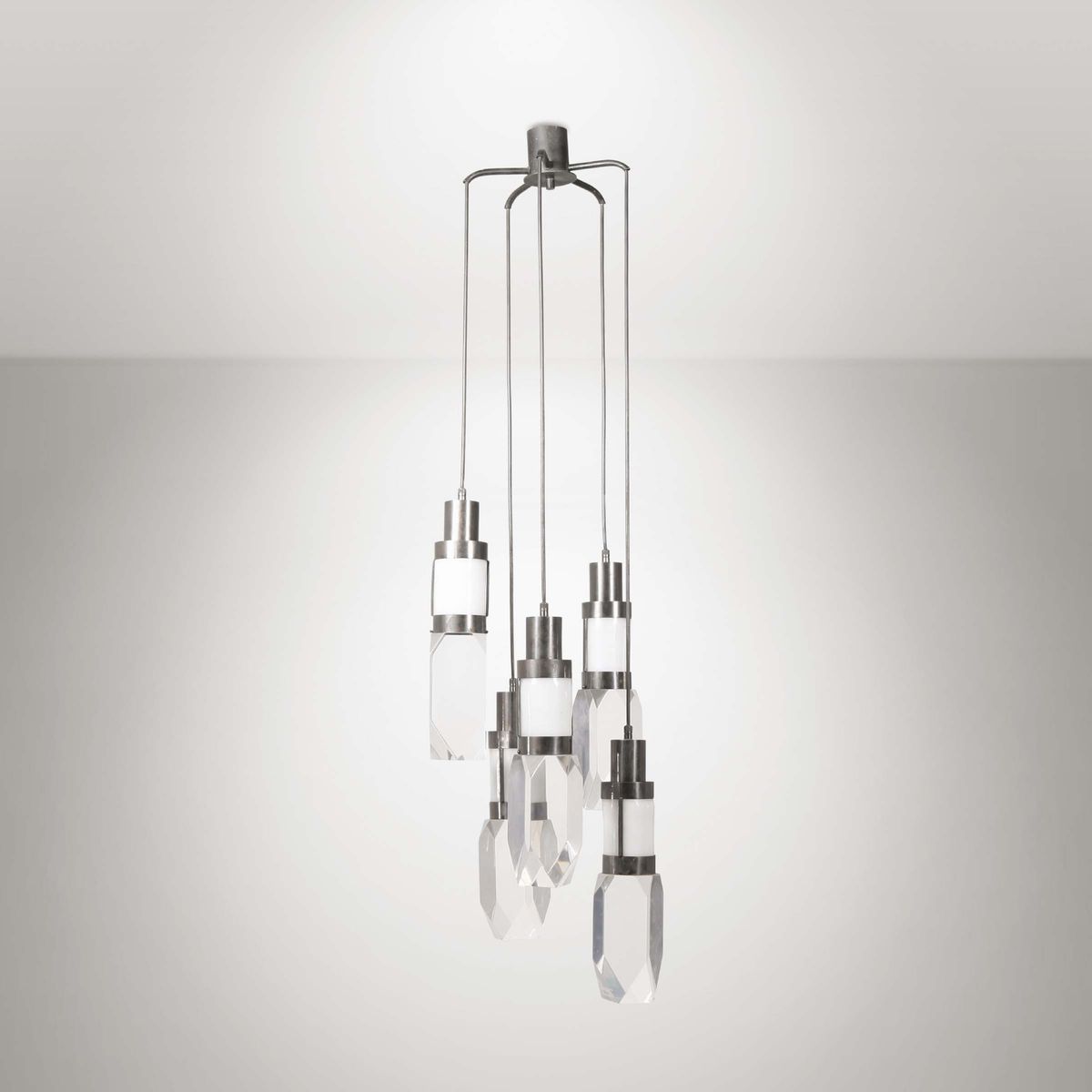 Lampada da sospensione in metallo cromato e perspex. Prod. Italia, 1970 ca. cm 38x118