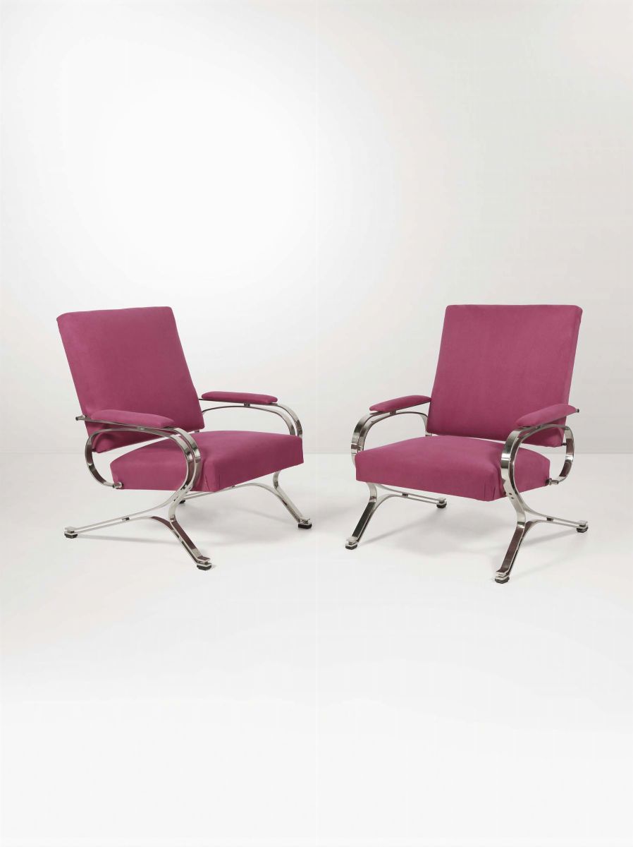 Coppia di poltrone Micaela con struttura in acciaio e rivestimenti in tessuto. Prod. Formanova, Italia, 1970 ca. cm 71x93x80