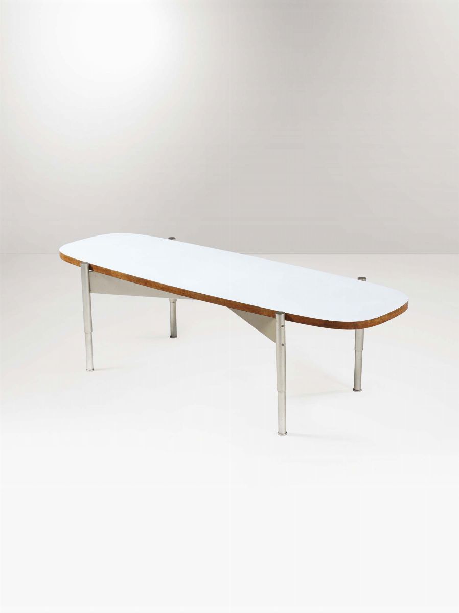 Tavolo basso progettato per l’hotel Parco dei Principi con struttura in metallo e piano in legno laminato.