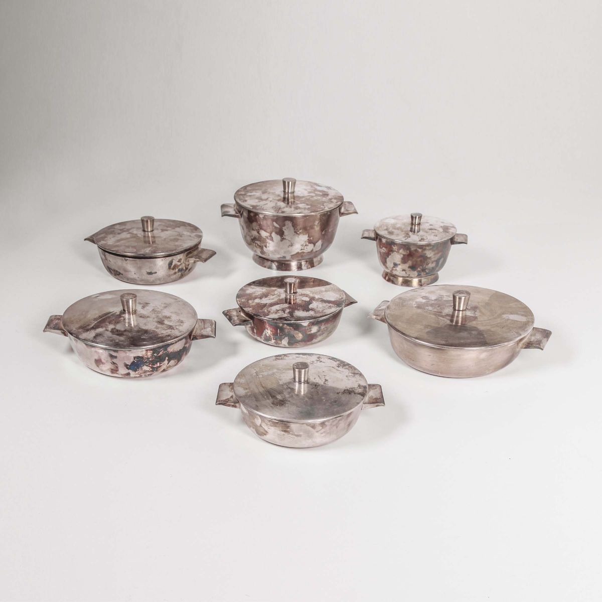 Sette contenitori per albergo in metallo argentato del servizio “VI Triennale”. Marchio inciso: Krupp Milano. Prod. Krupp, Italia, 1930 ca. cm diametri da 14 a 22; altezza da 6 a 18