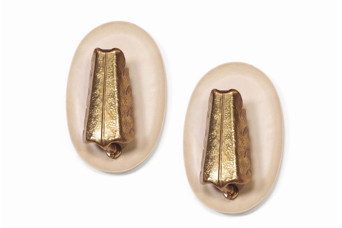 Coppia di appliques in legno laccato ed ottone lavorato. Prod. Oluce, Italia, 1950 ca. cm 20x29x10