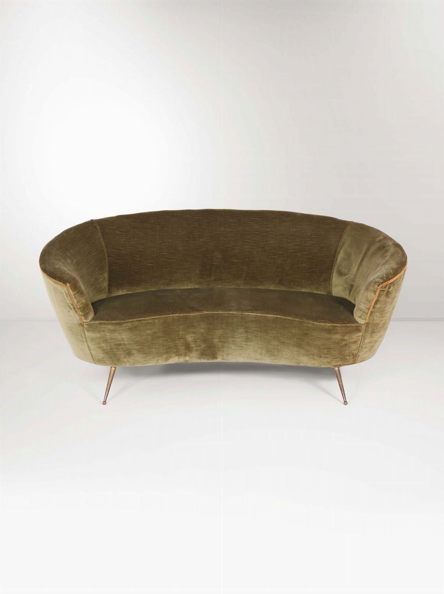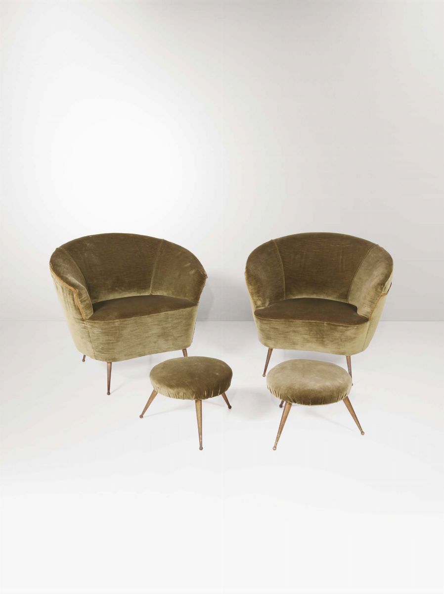 Salotto composto da un divano, due poltrone e due ottomane. Strutture in legno, supporti in ottone e rivestimenti in tessuto. Prod. ISA, Italia, 1950 ca.