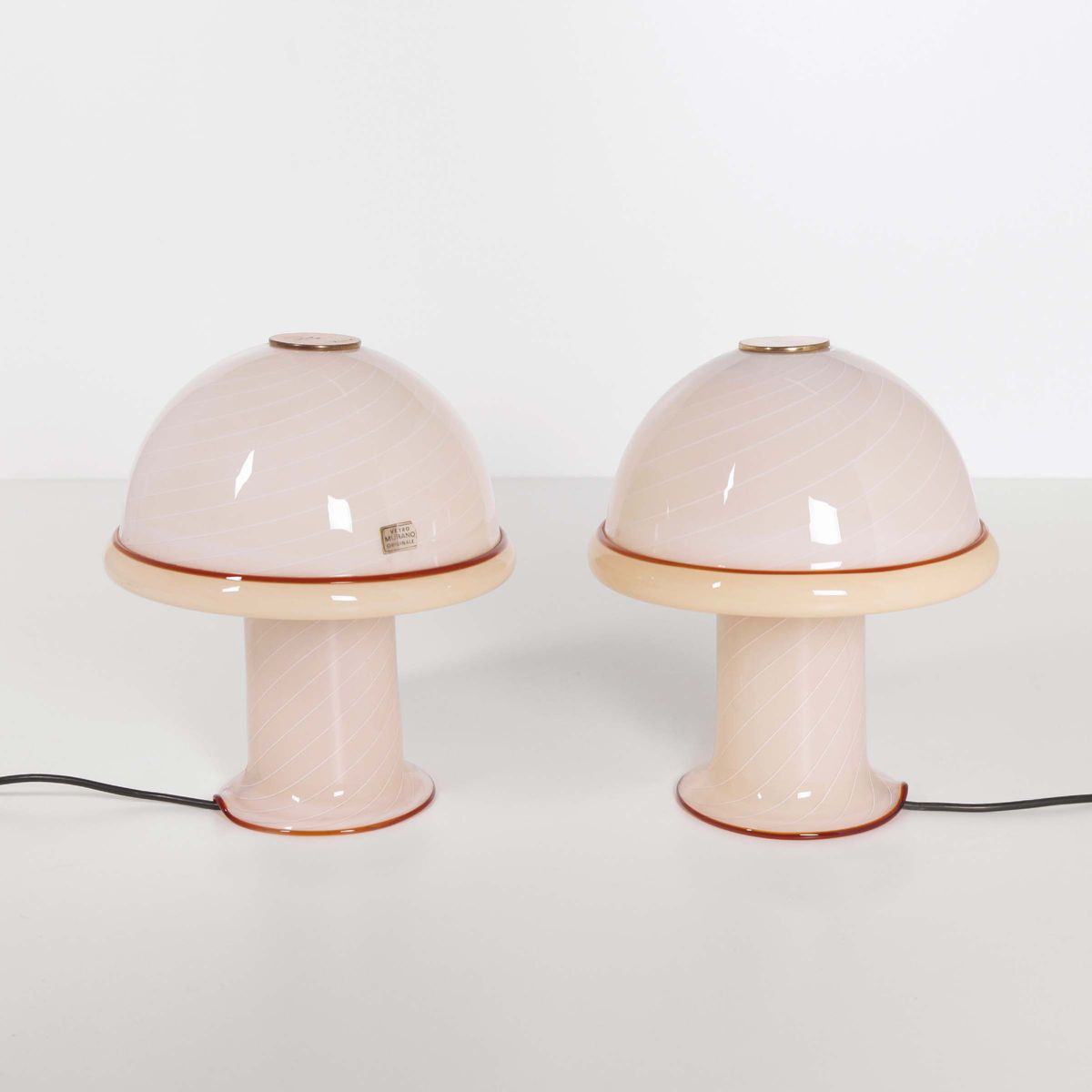 Coppia di lampade da tavolo con struttura in vetro di Murano e dettagli in metallo. Etichetta “Vetro di Murano”.