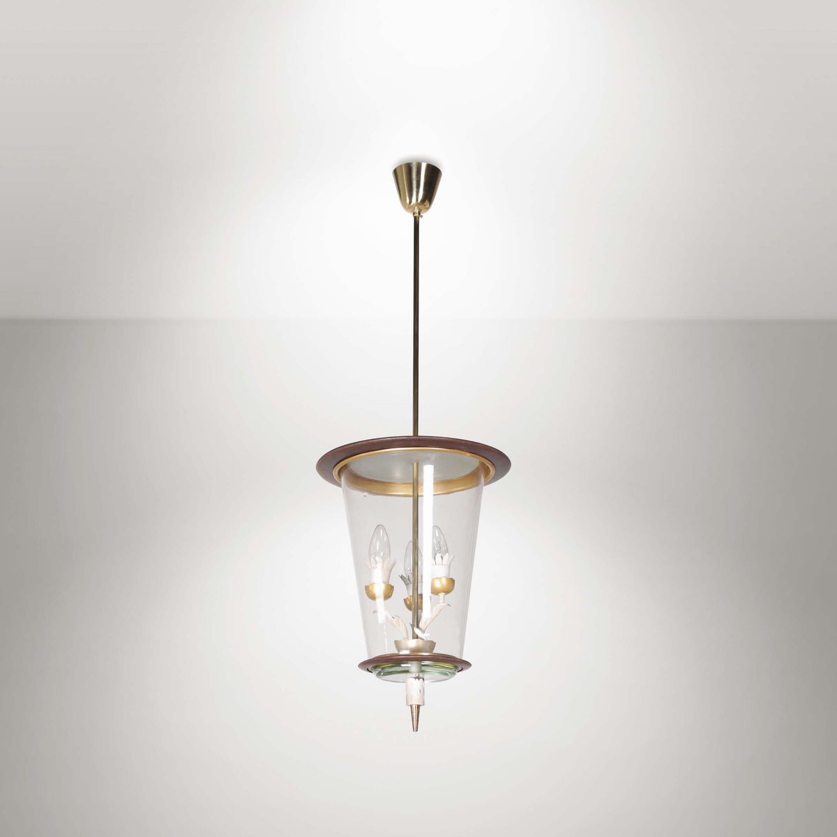 Lampada da sospensione in metallo laccato, ottone lucido e diffusore in vetro molato. Prod. Fontana Arte, Italia, 1950 ca. cm 35x100