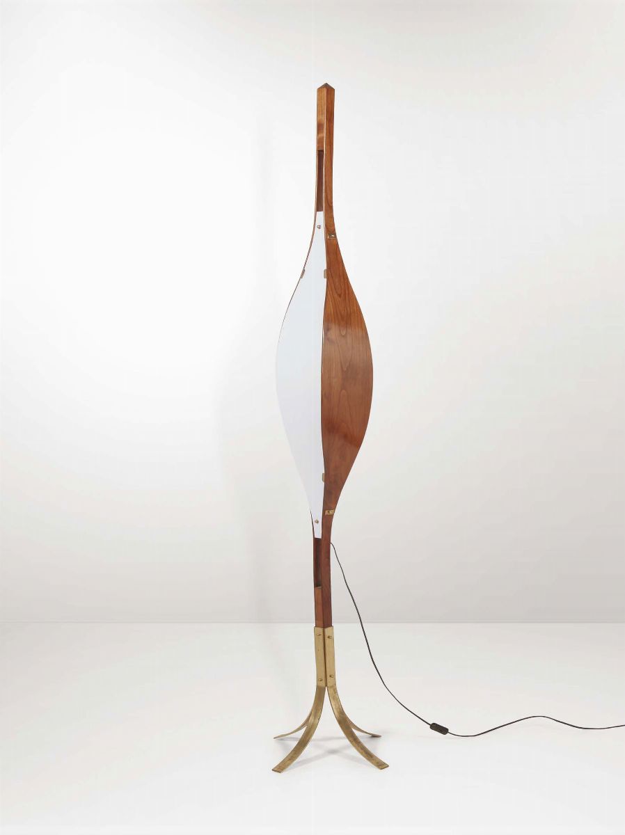 Lampada con supporto in ottone e struttura in legno e metacrilato. Prod. Reggiani, Italia, 1970 ca.