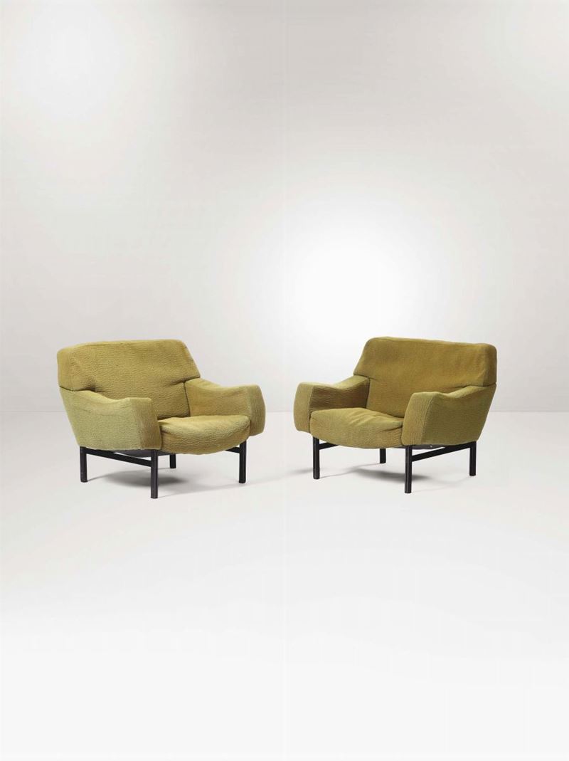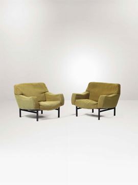 Salotto composto da due poltrone e un divano. Struttura in legno e rivestimenti in tessuto.