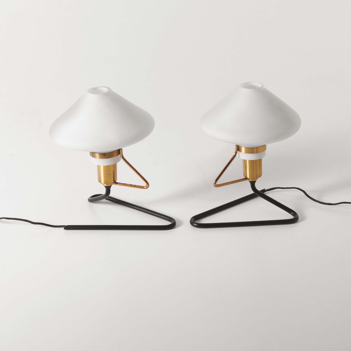 Coppia di lampade da tavolo con diffusore in vetro opalino e con struttura in metallo laccato e ottone lucido. Prod. Stilnovo, Italia, 1950 ca. cm 20x24x14