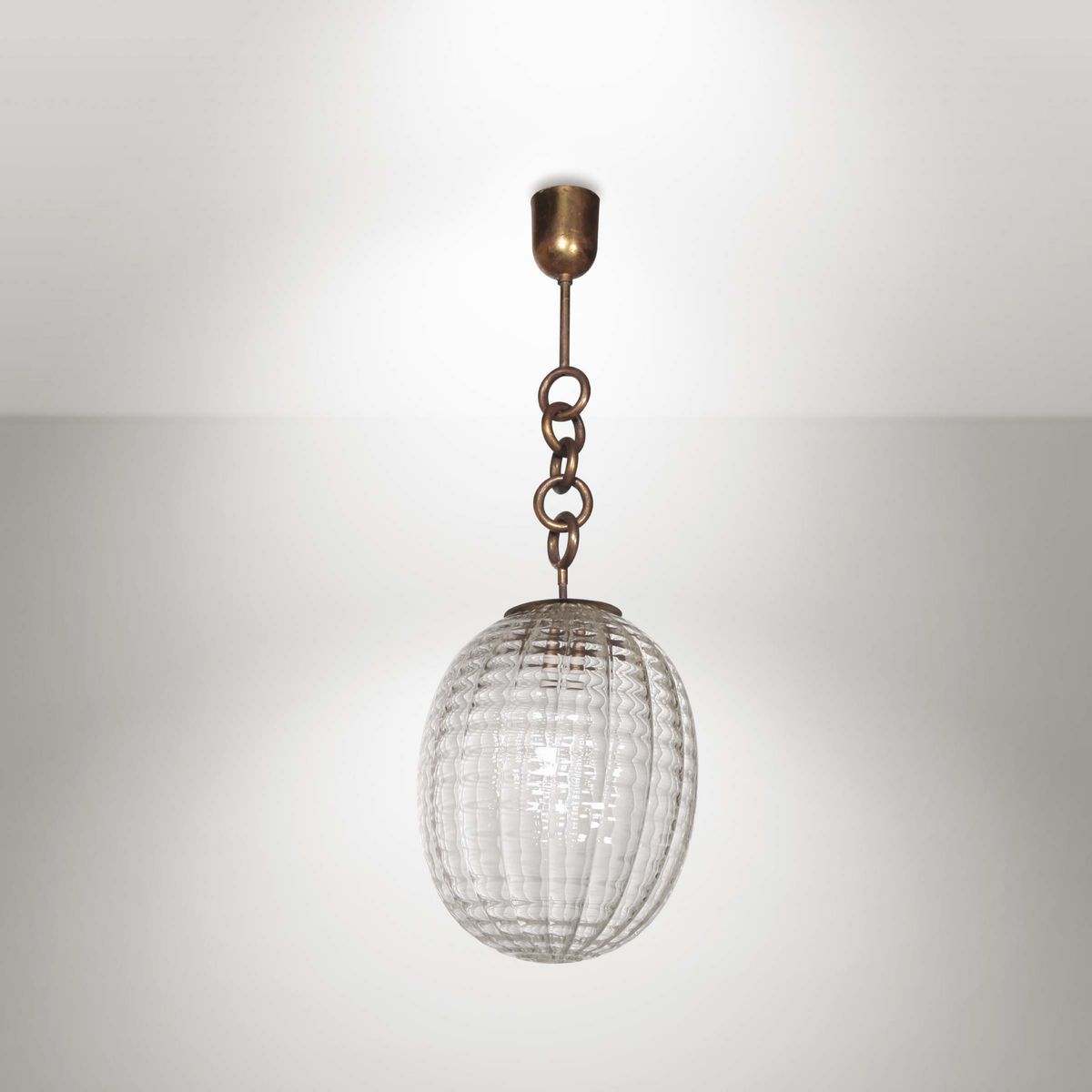 Lampada da sospensione con diffusore in vetro di Murano cordonato e struttura in ottone. Prod. Venini, Italia, 1930 ca. Prod. cm 30x92