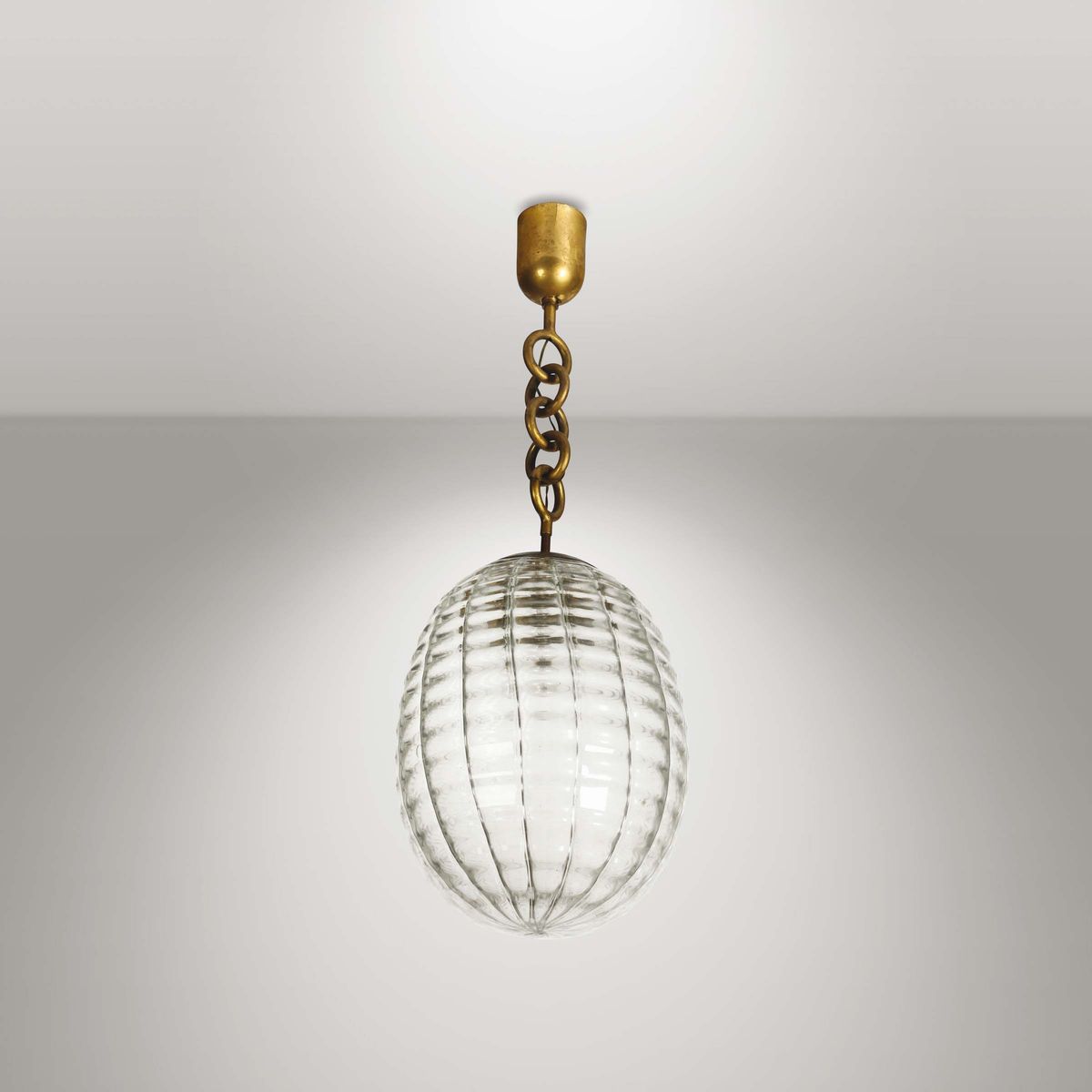 Lampada da sospensione con diffusore in vetro di Murano cordonato e struttura in ottone.