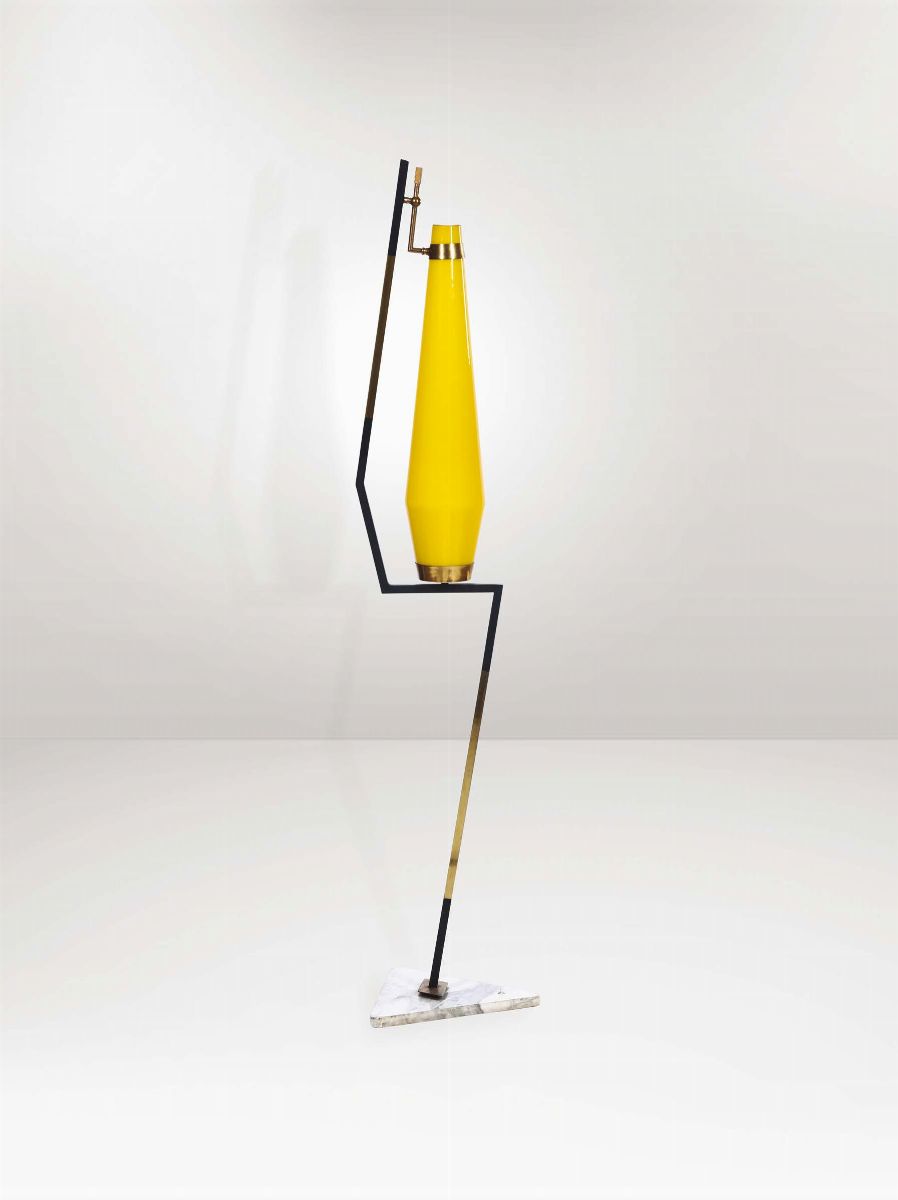 Lampada da terra con base in marmo, struttura in metallo verniciato e diffusore in vetro di Murano colorato.