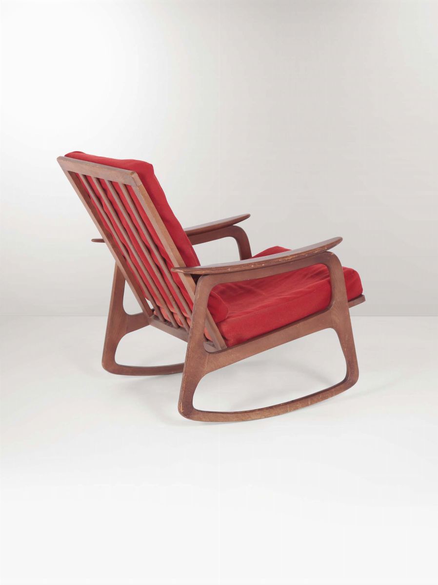 Poltrona a dondolo con struttura in legno e rivestimento in tessuto. Prod. Italia, 1950 ca. cm 67x84x84