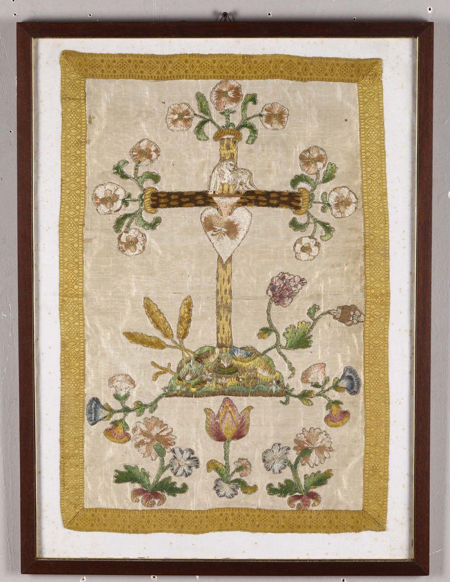 Antico ricamo raffigurante croce e motivi floreali, XVIII-XIX secolo