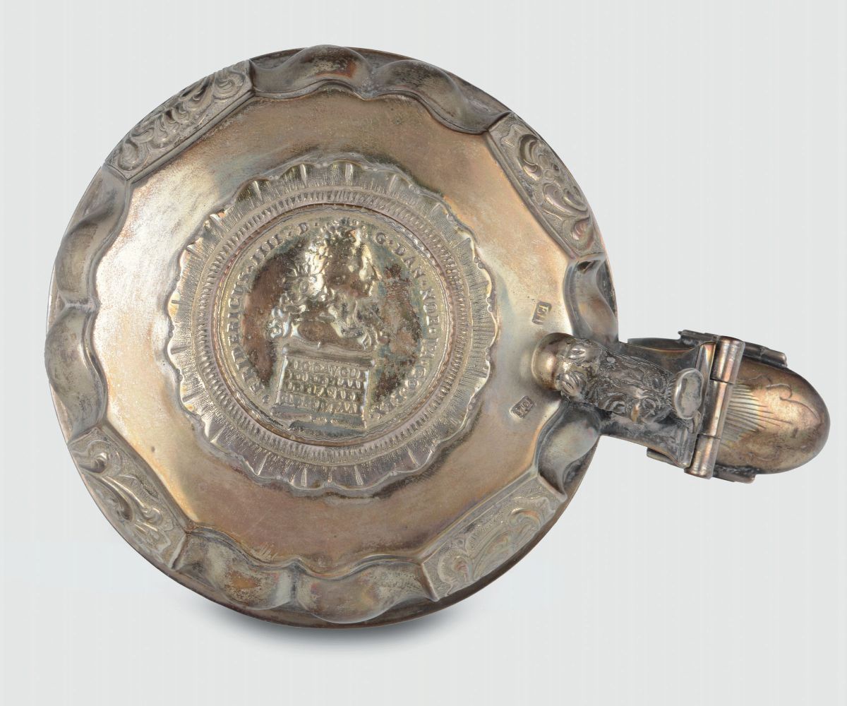 Boccale in maiolica Royal Copenaghen con coperchio in argento sbalzato, fuso e cesellato, boccale Copenaghen 1699/1730, [..]