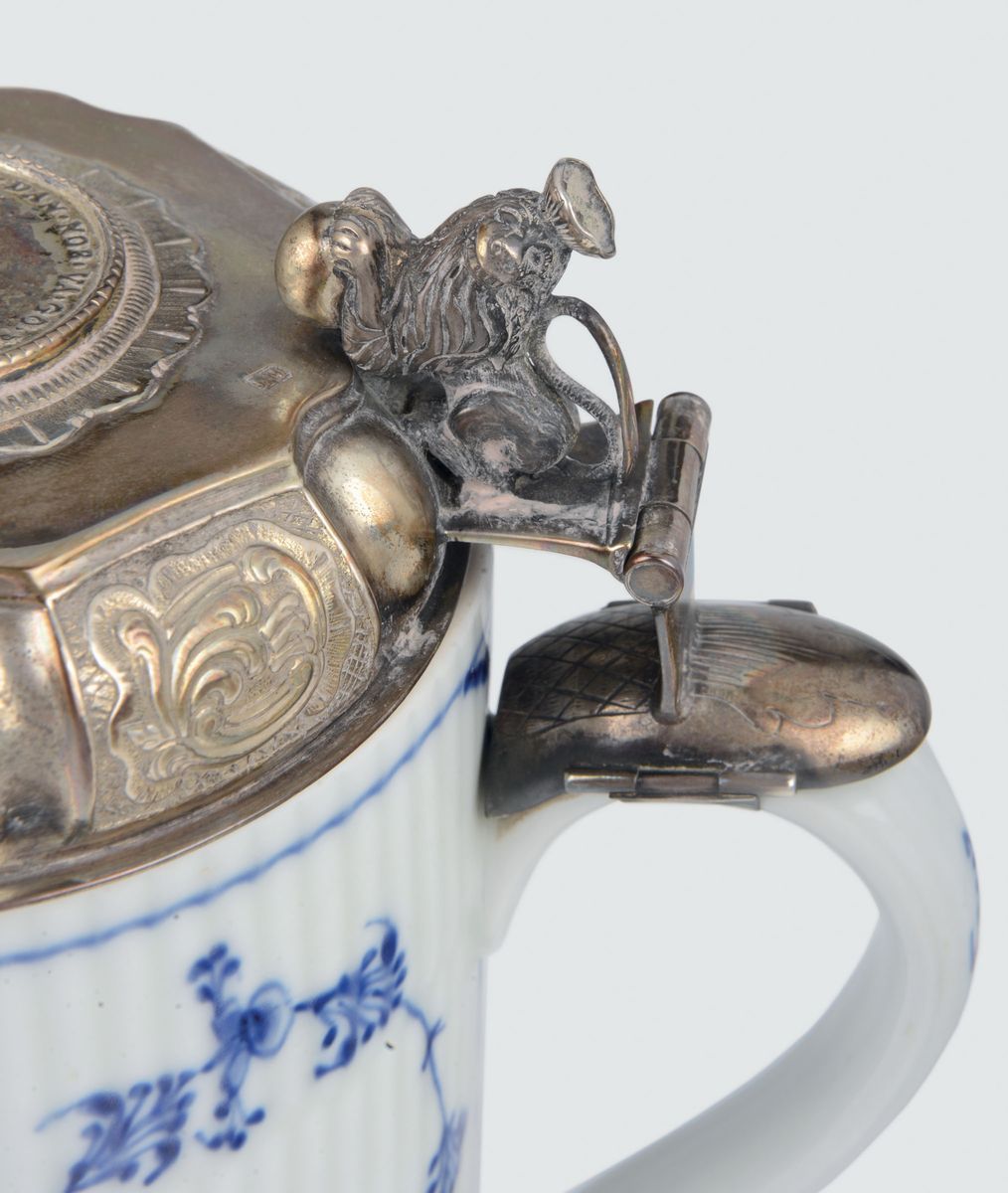 Boccale in maiolica Royal Copenaghen con coperchio in argento sbalzato, fuso e cesellato, boccale Copenaghen 1699/1730, coperchio Danimarca prima metà del XVIII secolo