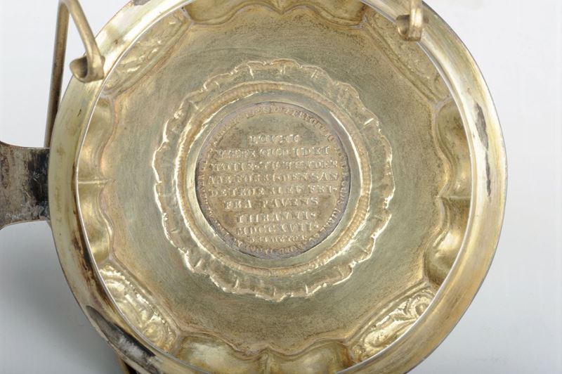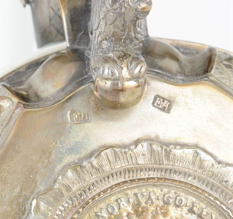 coperchio con bordo baccellato decorato con riserve a volute, sulla cerniera figura di leone rampante. Al centro del coperchio, entro riserva circolare, medaglione commemorativo, altezza cm 18