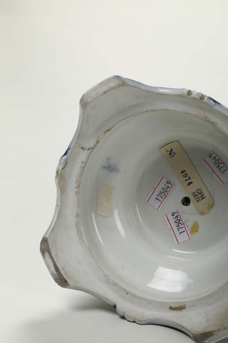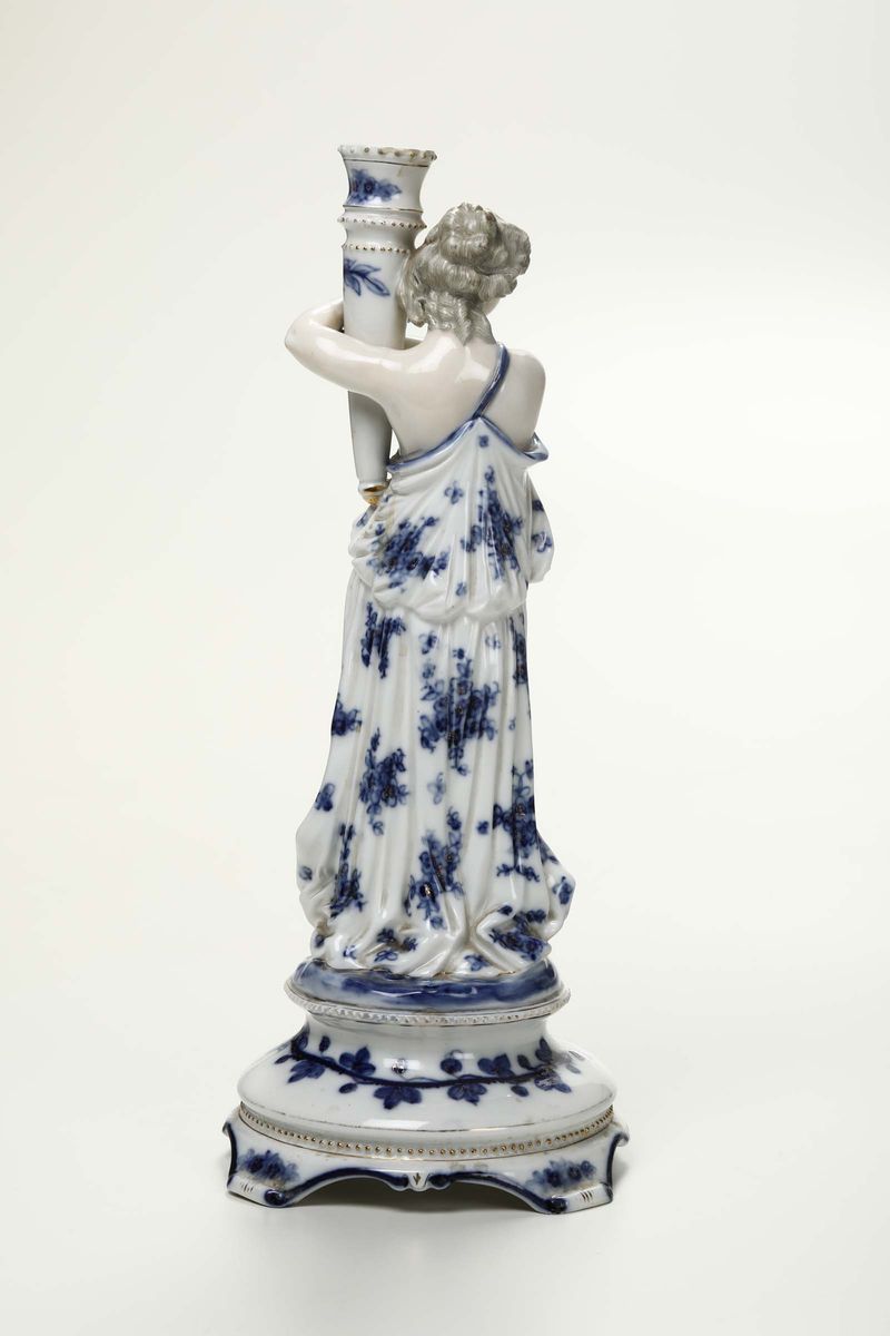Candeliere in porcellana bianca e blu raffigurante figura femminile, Ginori