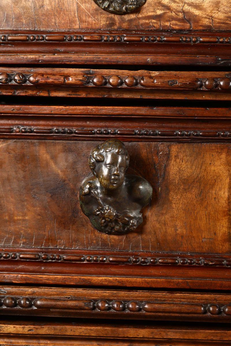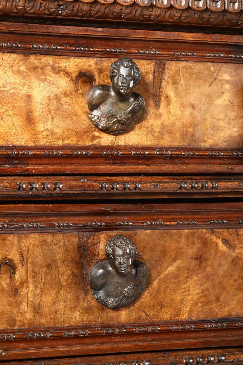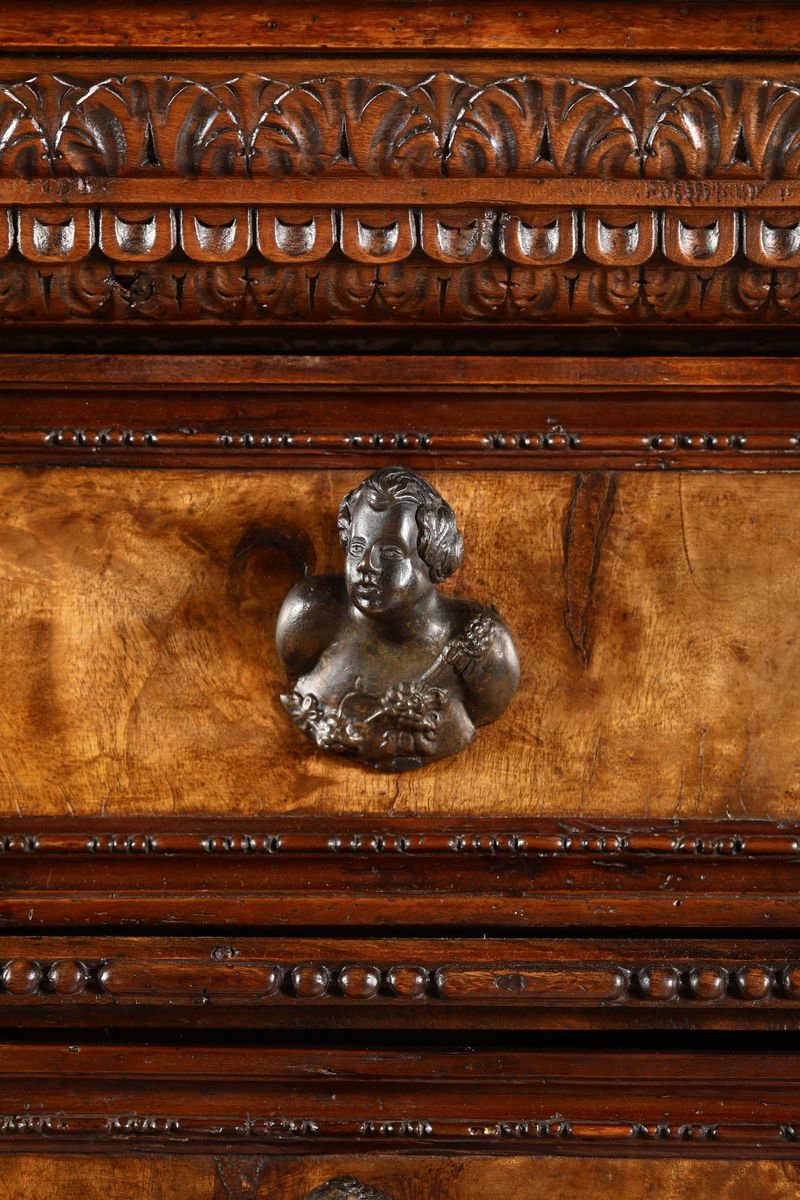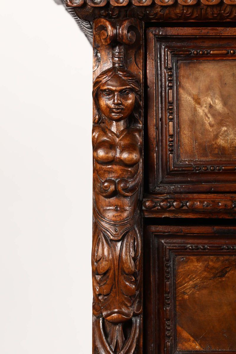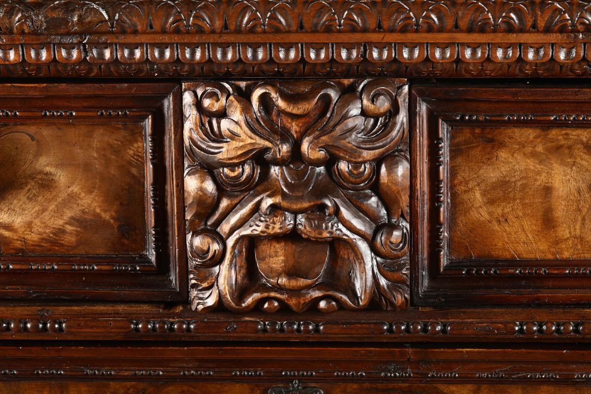 fronte a tre cassetti più due affiancati sotto il piano lastronati in radica, montanti intagliati con cariatidi, grottesche ed elementi fogliacei, bacellature alla base poggiante su piedi ferini, cm 148x69x130