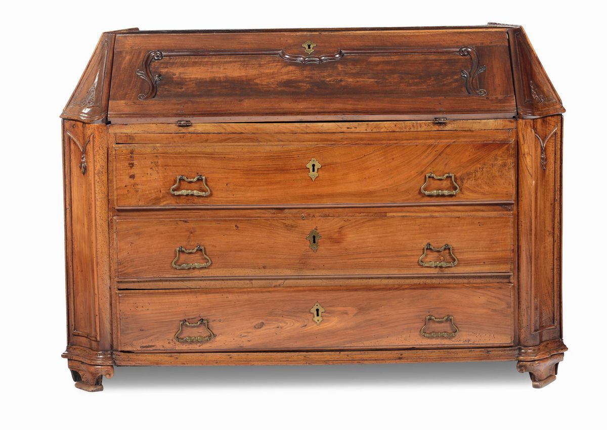 Cassettone a ribalta in noce intagliato, Parma, XVIII secolo
