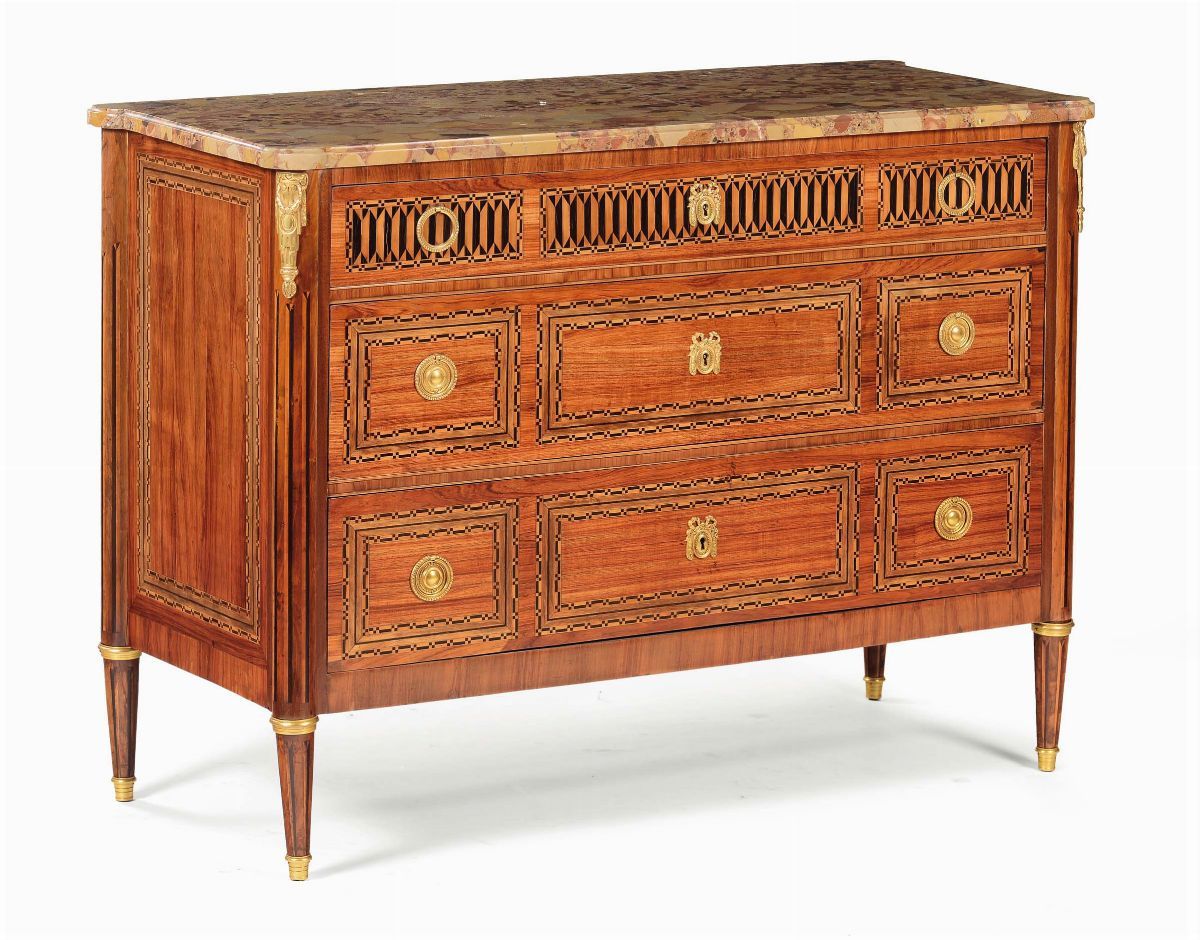 fronte a tre cassetti con intarsi e filettature, cm 120x50x88