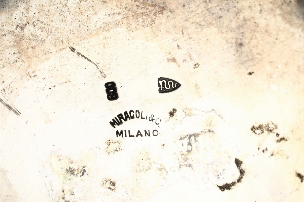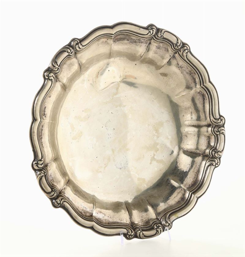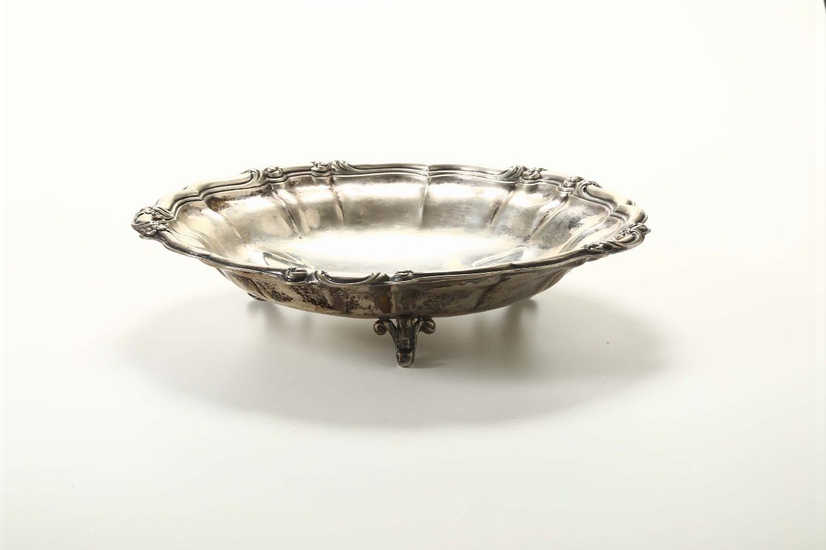 Centrotavola circolare tripode in argento, Miracoli & C., Milano