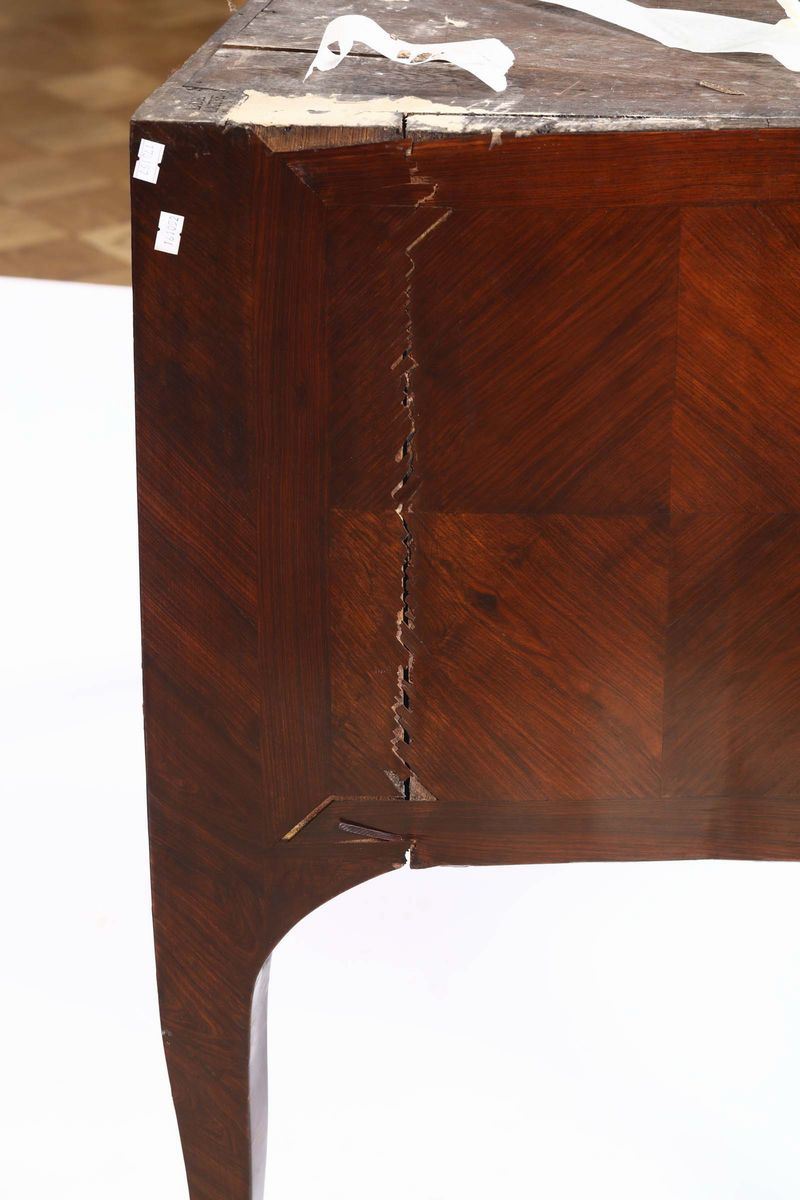 fronte e fianchi mossi, lastronato e filettato in legni vari, maniglie, bocchette e applicazioni in bronzo dorato, piano in marmo di breccia sagomato, cm 130x62x83 (difetti)