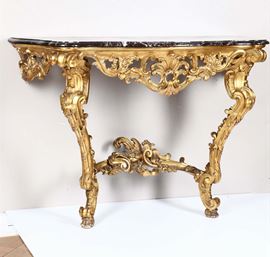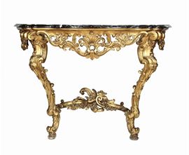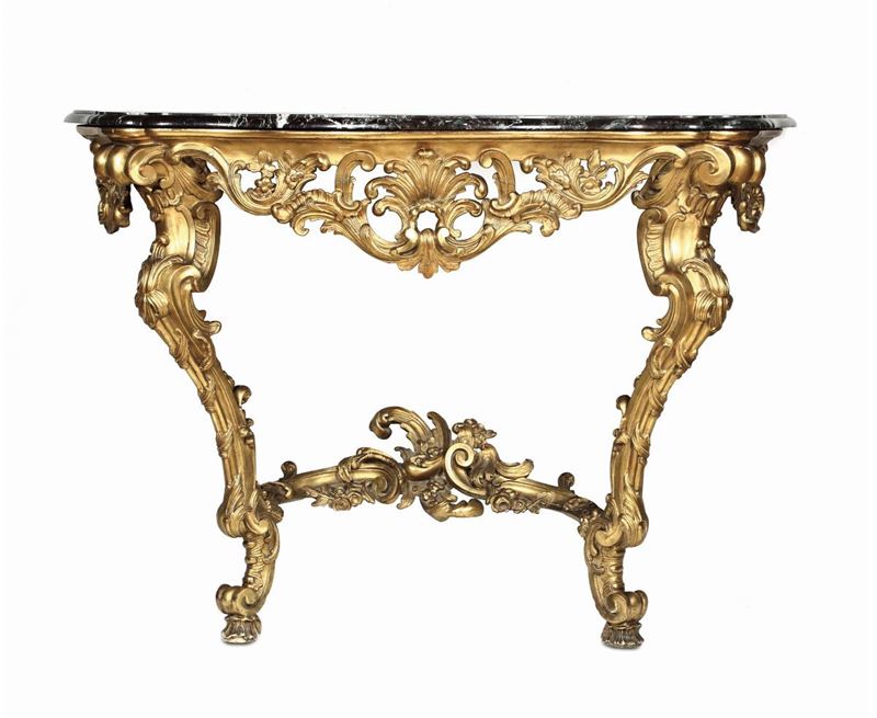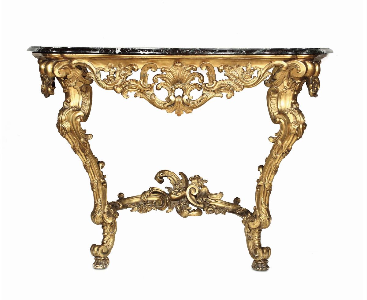 Consolle Luigi XV a goccia in legno intagliato e dorato, XIX secolo