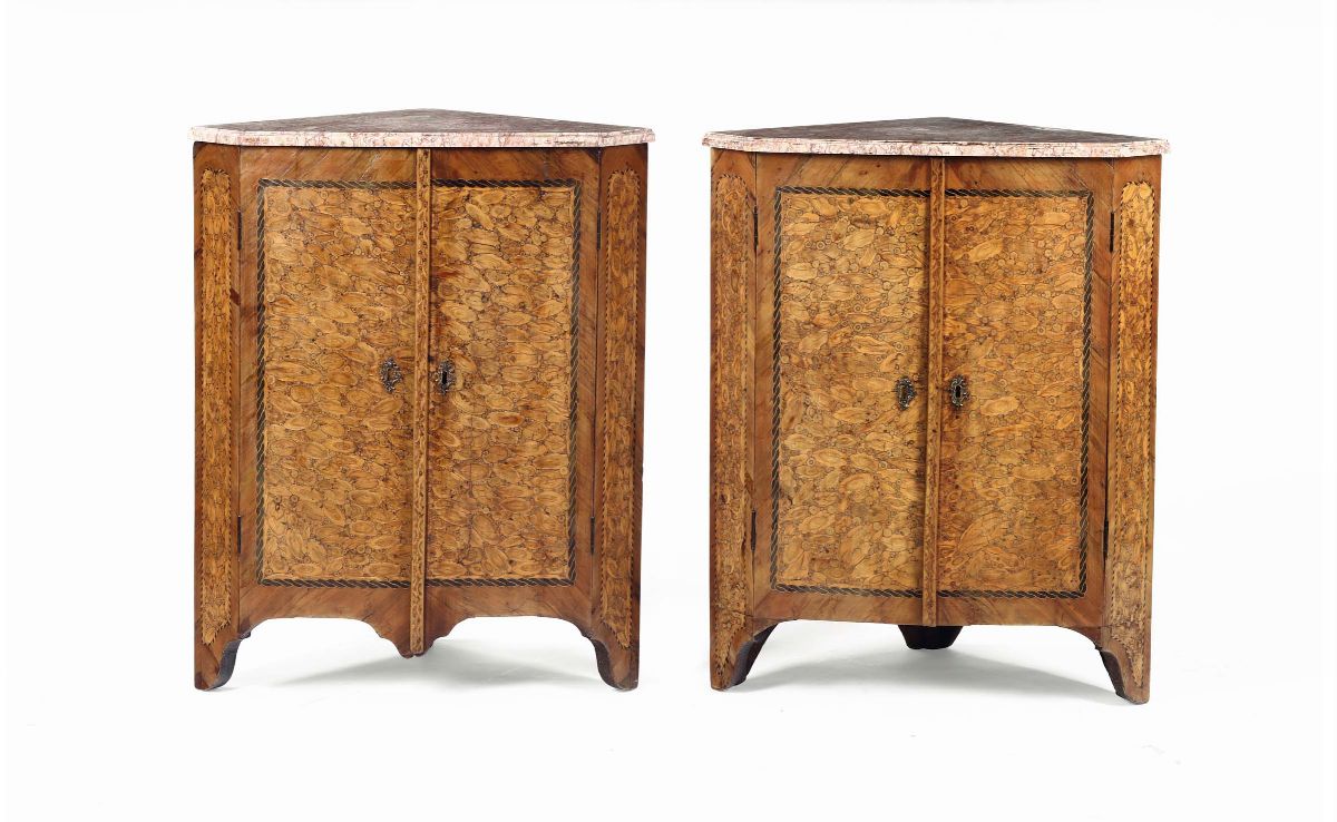 Coppia di angoliere a due ante lastronate e dintarsiate, XVIII-XIX secolo