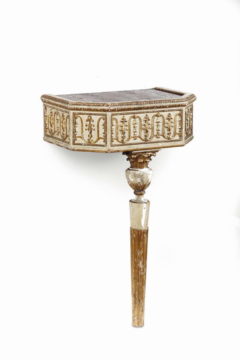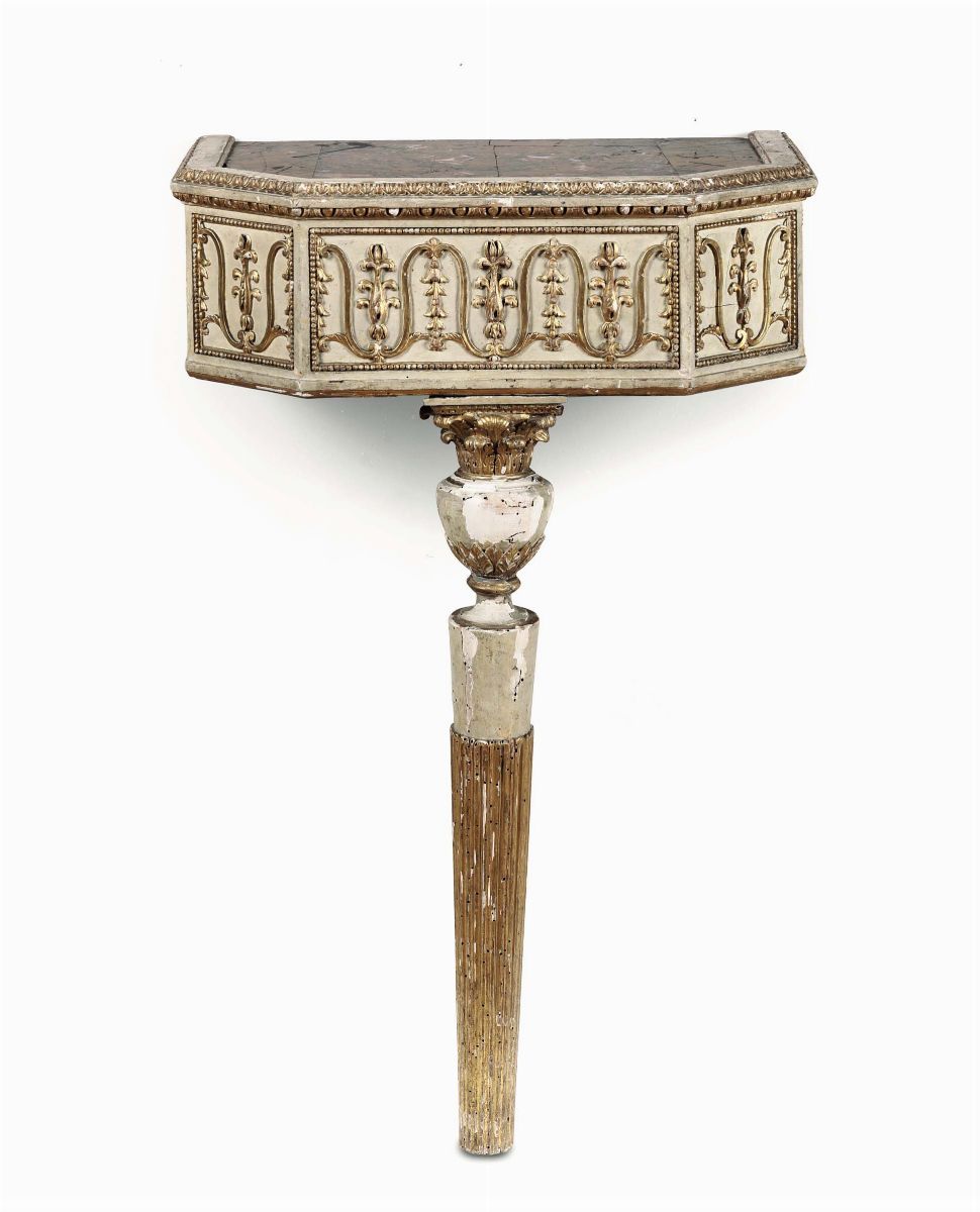 Coppia di consolles in legno intagliato, laccato e dorato, fine XVIII secolo