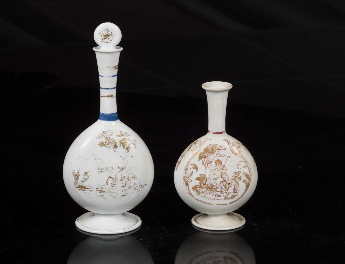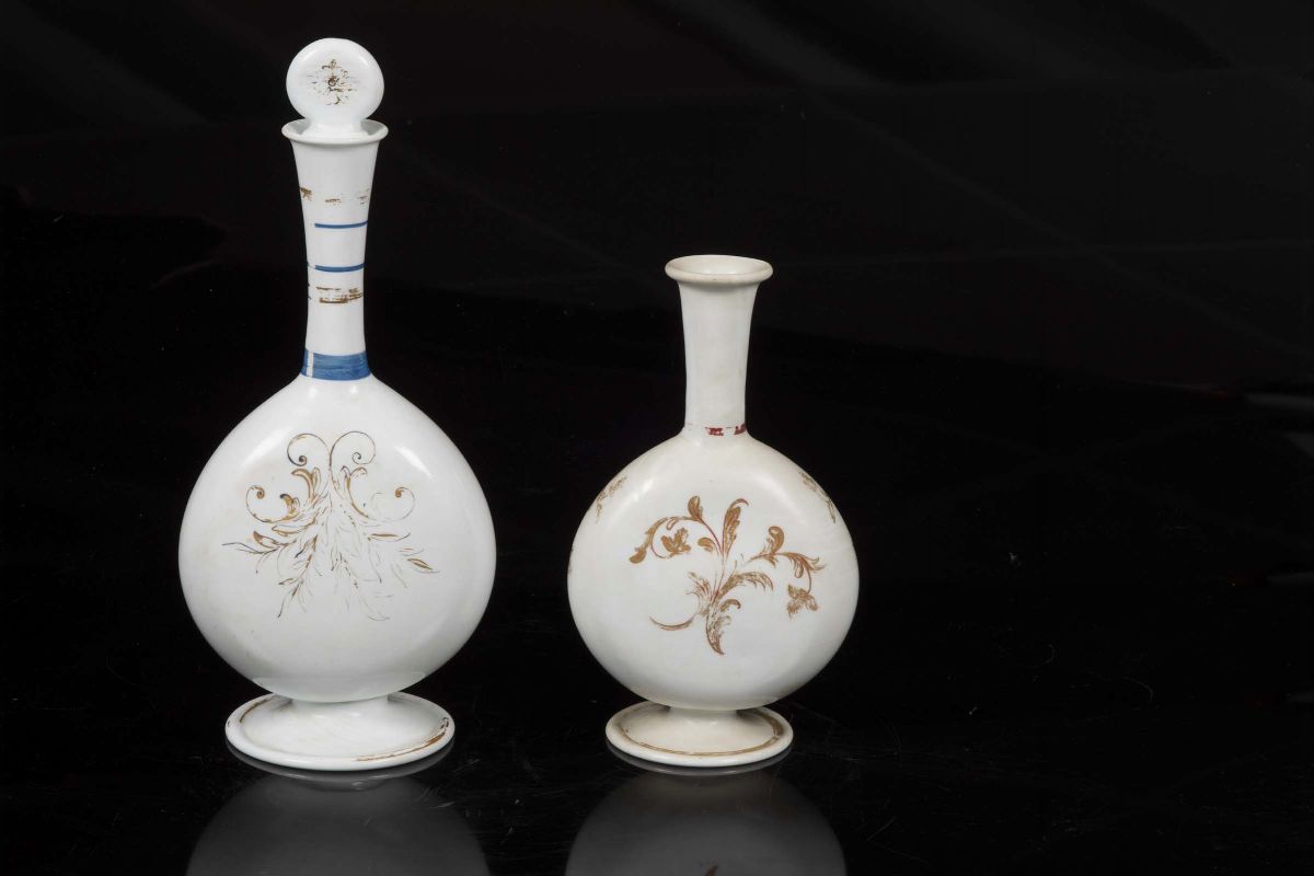 Coppia di fiasche su piede in vetro lattimo con decoro in foglia oro, Murano, XIX secolo